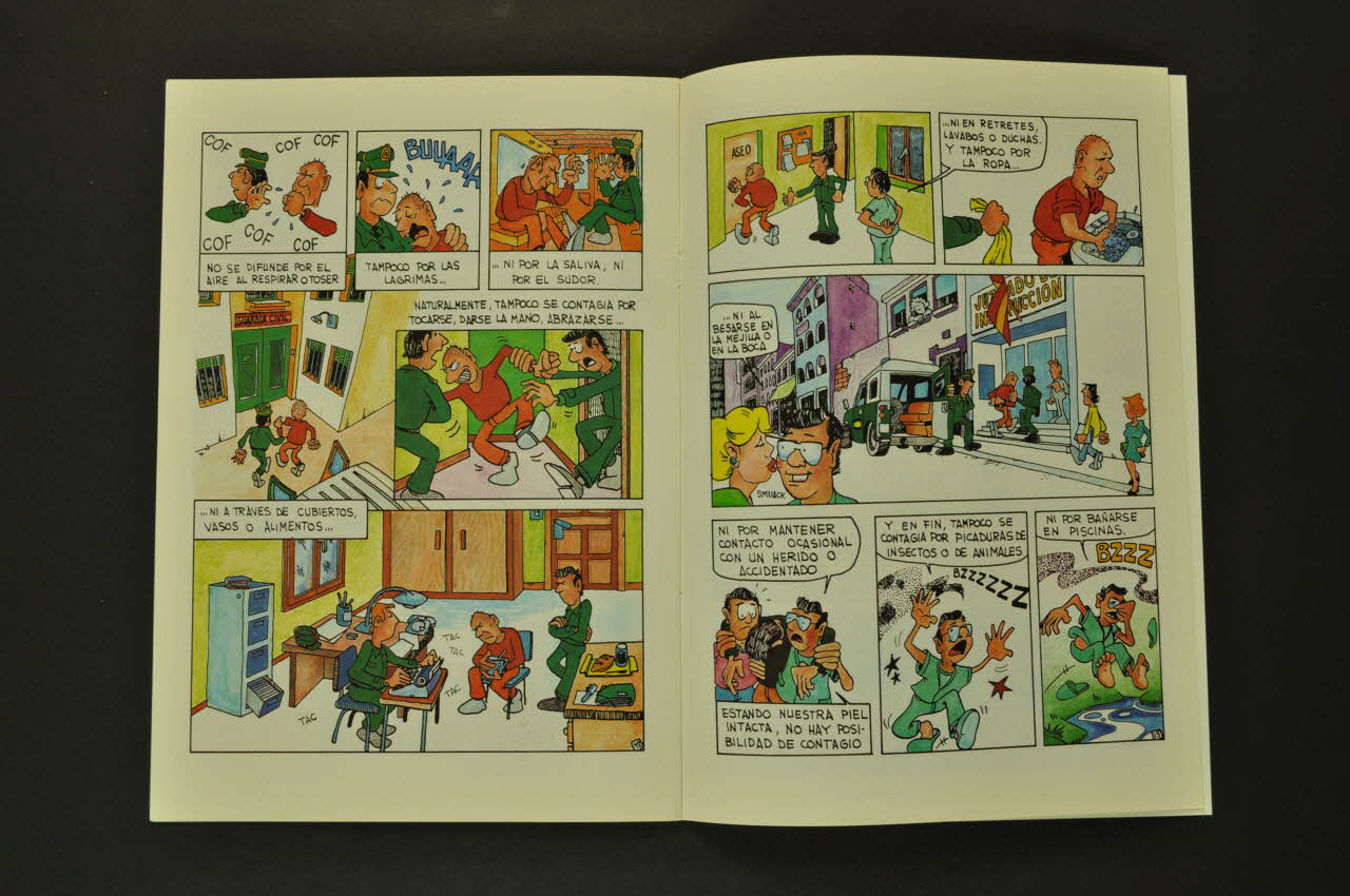 L'intérieur contient une bande dessinée figurant un membre de la Guardia Civil allant chez un dentiste, qui le renseigne sur le Sida : nature du virus, symptômes, moyens de prévention, etc.
