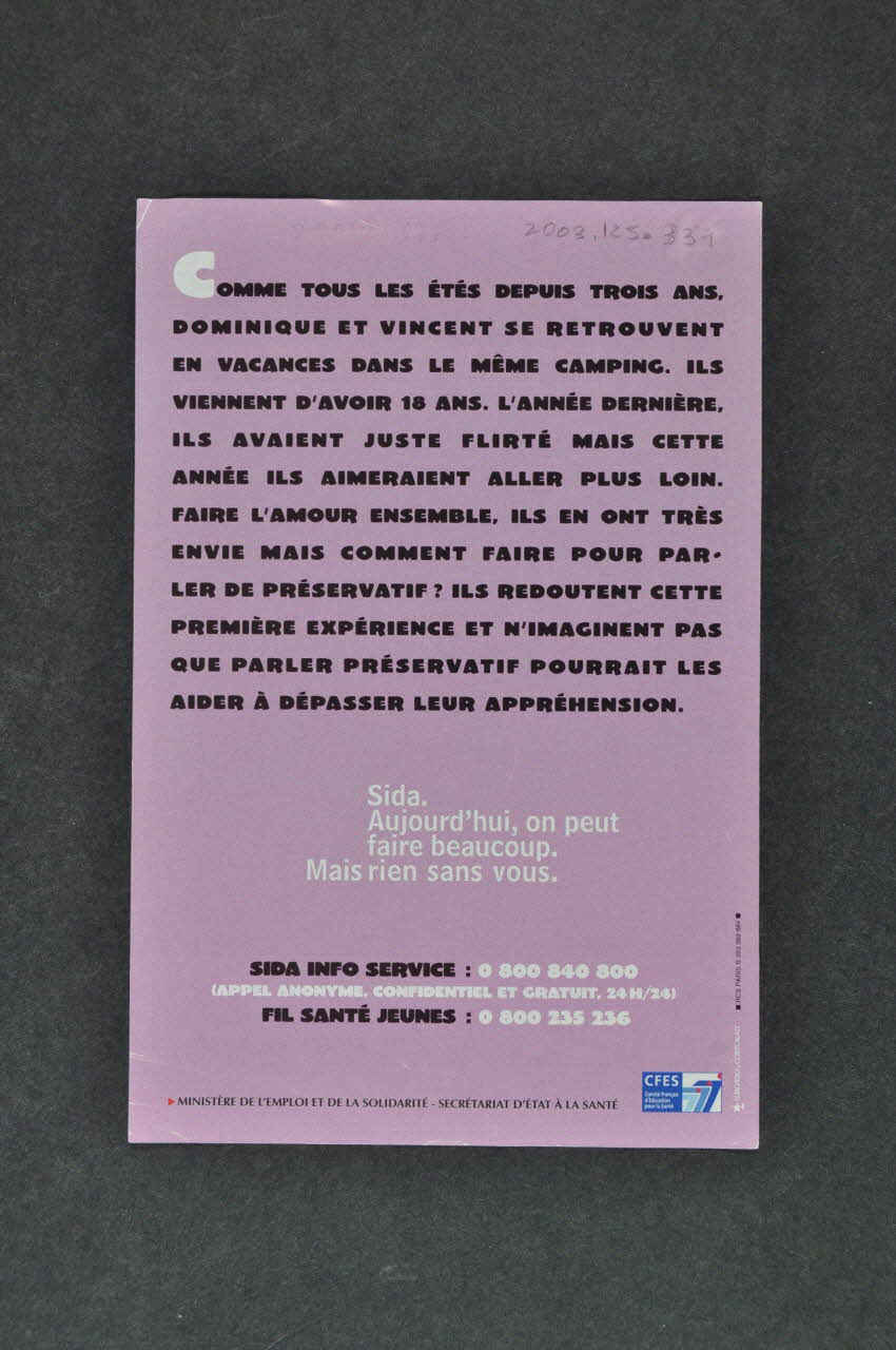 SIDA INFO SERVICE (...) // FIL SANTE JEUNES (...) (inscription en noir et blanc sur fond rose en bas), versoSlogan