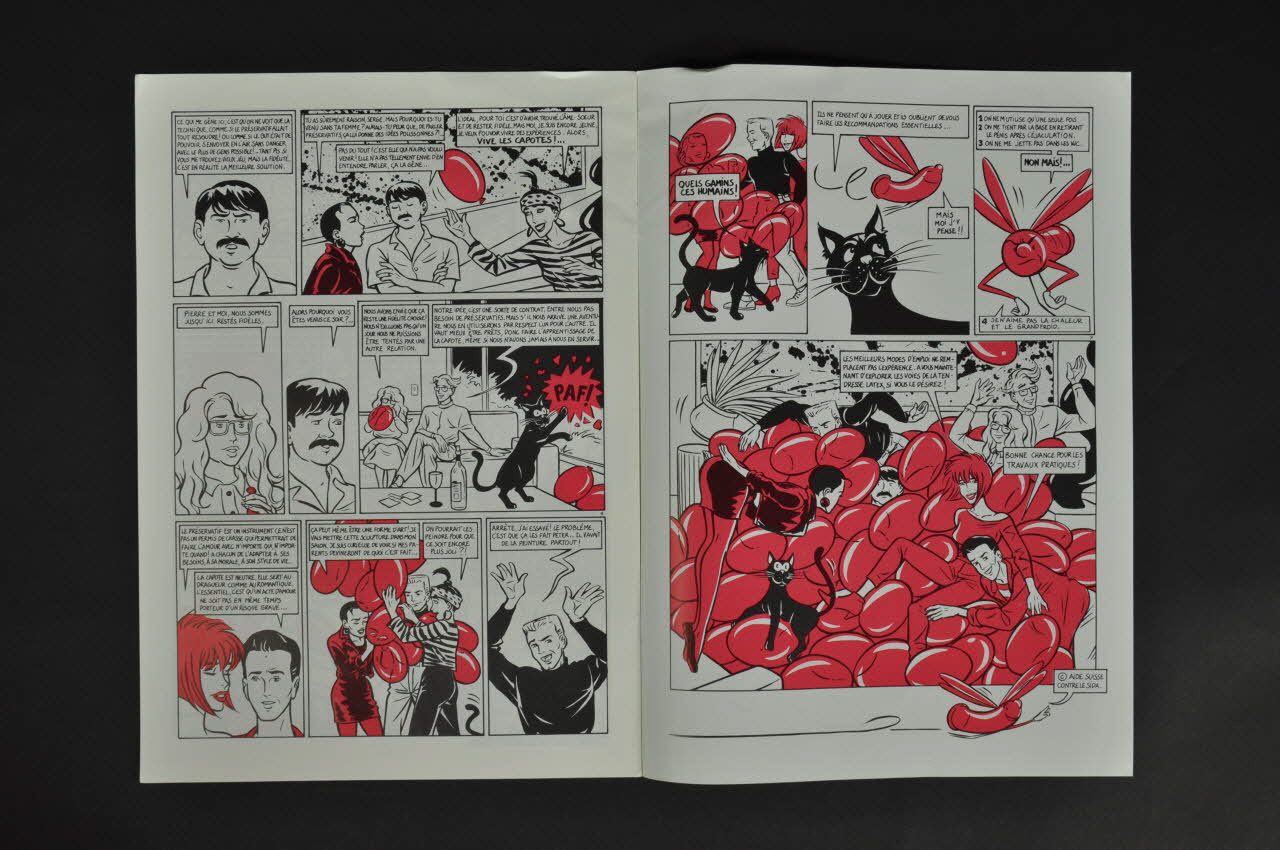 La première de couverture présente en pleine page un dessin en rouge et blanc sur fond noir, représentant une femme et plus en arrière un homme, tous deux chevauchant des sortes de libellules géantes. L'arrière comporte un texte sur fond blanc, avec trois schémas expliquant la pose et le retrait d'un préservatif. En bas sont reportées les adresses des antennes de l'association. L'intérieur contient une bande dessinée précédée d'une page résumant l'histoire des épisodes précédents. Les dessins sont également en noir, blanc et rouge. Dans cette brochure, un groupe de protagonistes discutent du préservatif dans un salon, tout en jouant avec des préservatifs gonflés à la manière de ballons.Inscriptions