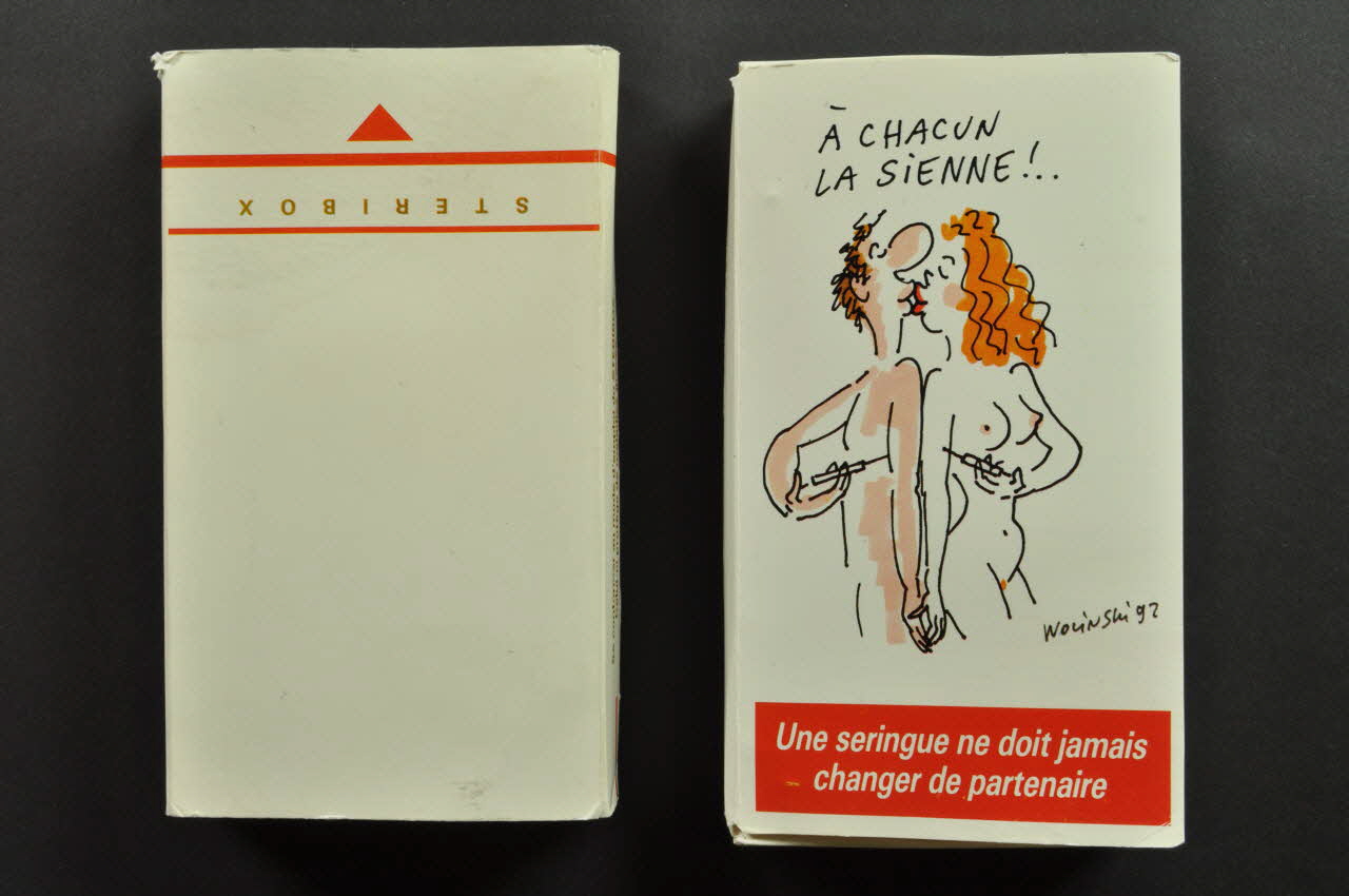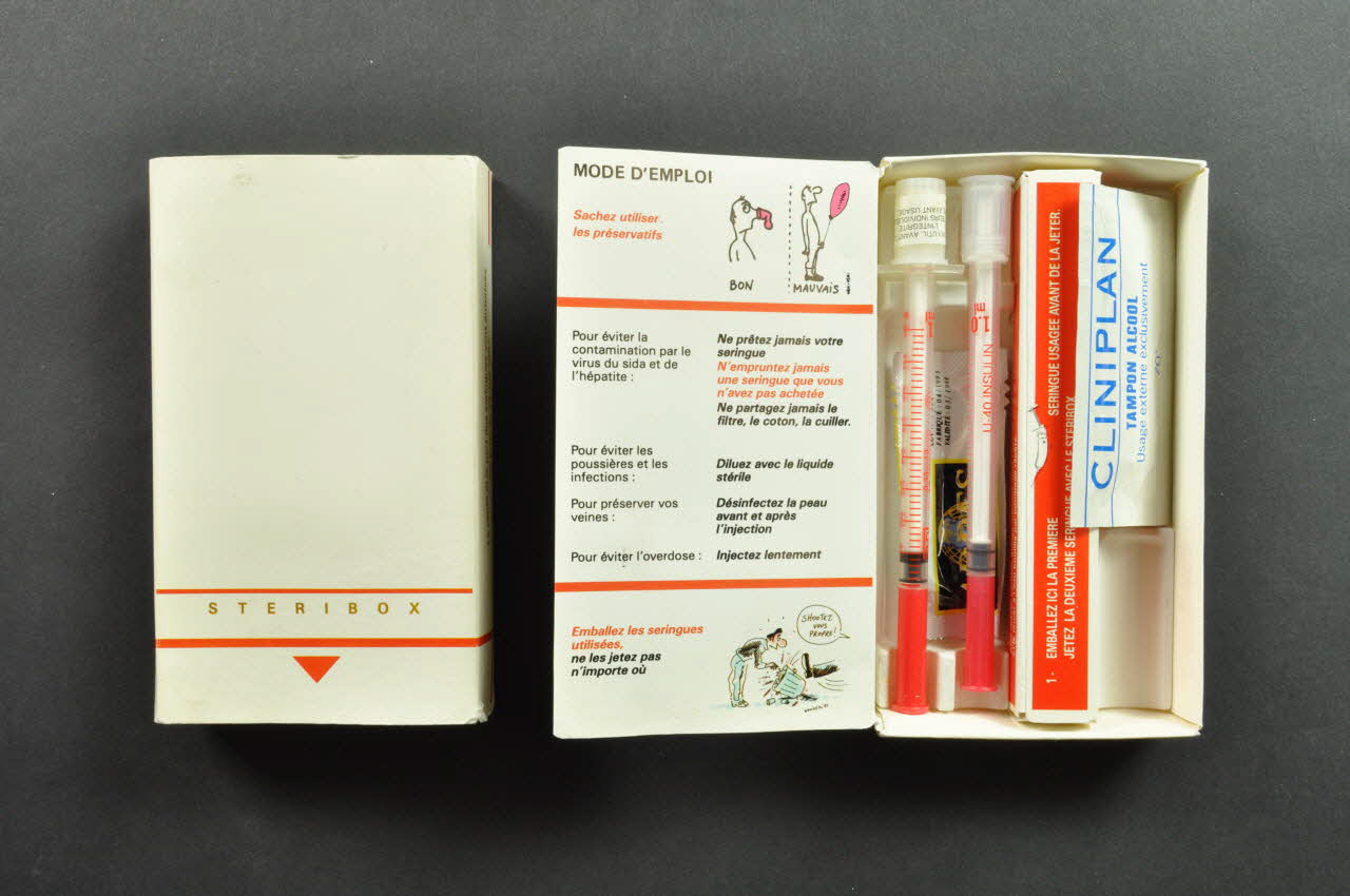 Dite "Stéribox", cette boite blanche en carton de forme rectangulaire se présente à l'intérieur d'un étui et contient deux seringues, un emballage cartonné pour seringue usagée, un tampon d'alcool, un préservatif, un message d'information et de prévention. Elle est illustrée par des dessins de Wolinski.Inscriptions
