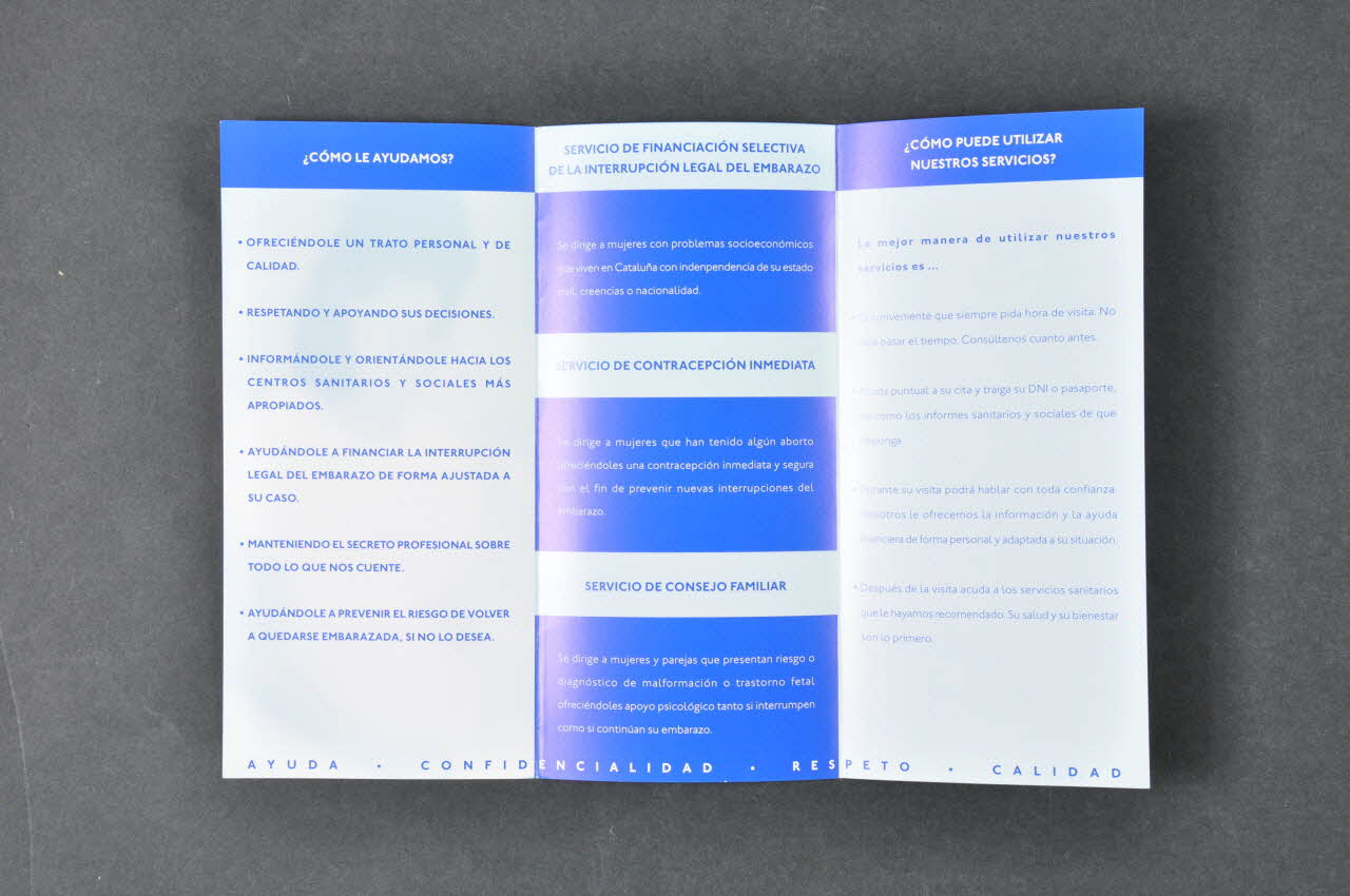 Résumé. A cheval sur les feuillets 1 à 3 : "Aide, confidentialité, respect, qualité" Feuillet 1 "Comment nous aidons?" : personnalisation de chaque cas / respect des décisions / information et oriantation vers les centres spécialisés / appui financier à l'interruption légale de la grossesse / secret professionnel / aide à la prévention de grossesses non désirées. Feuillet 2 les services: Service de financement sélectif de l'interruption légale de la grossesse / Service de contraception immédiate (pour les femmes qui ont eu un avortement) / Service de conseil familial (appui psychologiques pour les femmes ayant un risque ou un diagnostic de malformation foetale) Feuillet 3 "Comment pouvez-vous utiliser nos services ?" Feuillet 4 Centres partenaires : Cliniques privées et centres publics.