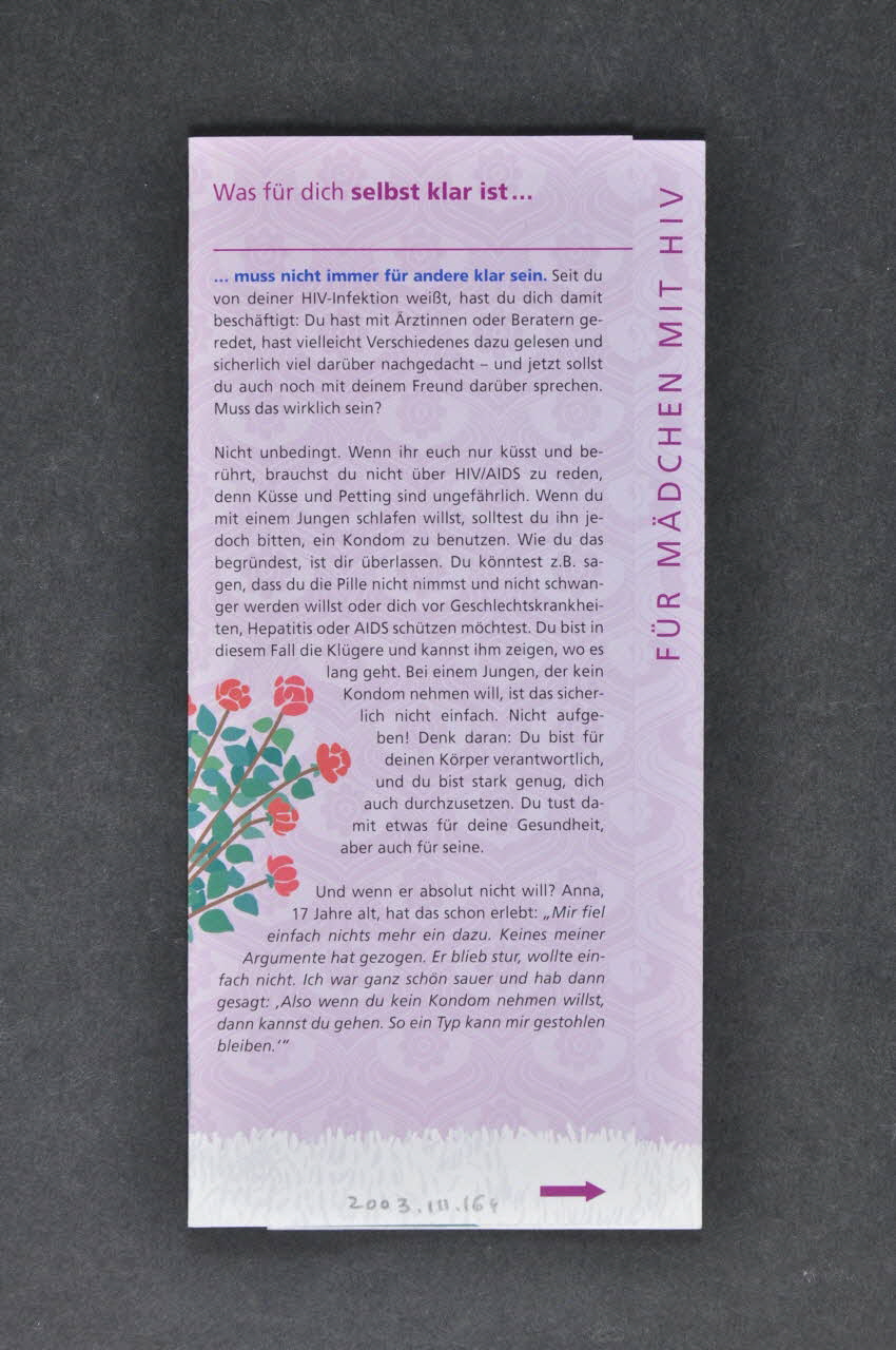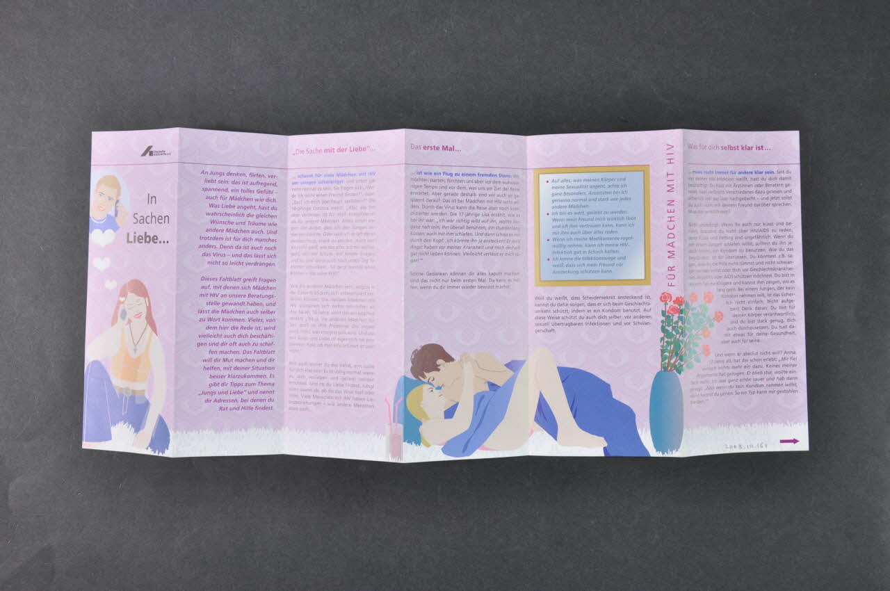 "Die Sache mit der Liebe"... // // Das erste Mal... // // Was für dich selbst klar ist... // // Wenn du so richtig verliebt bist... // // Du bist nicht allein... // // Information, Beratung und Hilfe... // // Lesestoff // // Impressum (En violet sur les deux faces.), à l'intérieurFUR MÄDCHEN MIT HIV (Visible depuis la couverture sur les deux côtés mais sur le quatrième volet de la face supérieure et sur le troisième de la face inférieure.), sur la couvertureDécor