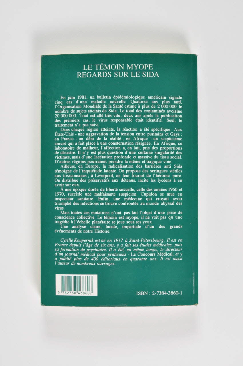 Livre de 188 pages publié en 1995 à couverture souple verte. unie. En blanc de haut en bas nom de l'auteur "Cyrille Koupernik", titre : "Le témoin myope. Regards sur le sida.", éditeur : L'Harmattan et collection :"Santé, sociétés et cultures".