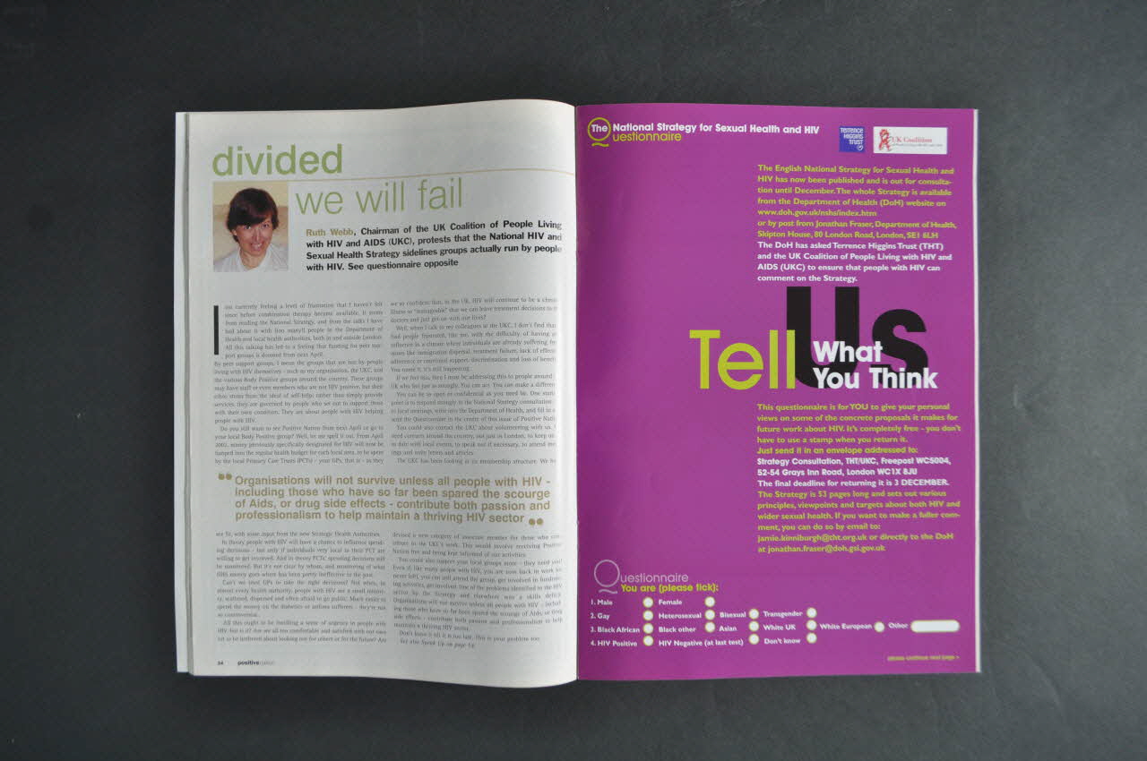 La revue est composée de 68 pages agrafées, comprises dans une couverture en papier glacé. Il s'agit du numéro 72 de cette collection. La page de couverture présente sur fond noir le portrait d'un jeune homme aux yeux bleux, portant une casquette. Au-dessus, le titre de la revue est inscrit en lettres bleues et oranges claires. Dans l'angle inférieur gauche sont indiqués, en colonne et en lettres oranges et blanches, les thèmes abordés dans le numéro. Le titre principal est annoncé en haut de la page, à droite, sous le titre de la revue. Il est inscrit en lettres rouges et bleues. Dans l'angle inférieur gauche de la page, un logo inscrit indique qu'à l'intérieur du magazine se trouve un questionnaire pour demander aux lecteurs leur avis sur le English National Strategy for Sexual health and HIV. La page 3 présente le sommaire, en caractères bleus, noirs, oranges et rouges sur fond blanc. Les autres pages sont imprimées de caractères noirs et photographies couleur et noir et blanc. L'organisation du magazine se fait comme suit: trois ensembles d'articles intitulés "features" (portraits), "treatments", et "regulars" (informations régulières). Y sont répartis, dans cet ordre, divers articles et rubriques: une interview de Mark Ravenhill, play boy gay, écrivain et séropositif; la campagne de Gay Men fighting Aids sur le bare back; l'éducation sur le VIH dans les collèges et les universités; un reportage sur le thème "gay et séropositif à la Trinidad"; Musulmans et Juifs séropositifs en Grande Bretagne; recherche de parents adoptifs pour la jeune Sarah; protestation contre la politique VIH; Africains et sans papiers au nord ouest de la Grande Bretagne; nouvelles des traitements (résistances...): la tuberculose, le T 20, les femmes et les traitements, l'hypnothérapie; lettres de lecteurs; témoignages; la page des arts; la recette du mois; encart avec le questionnaire de l'English National Strategy for Sexual health and HIV.