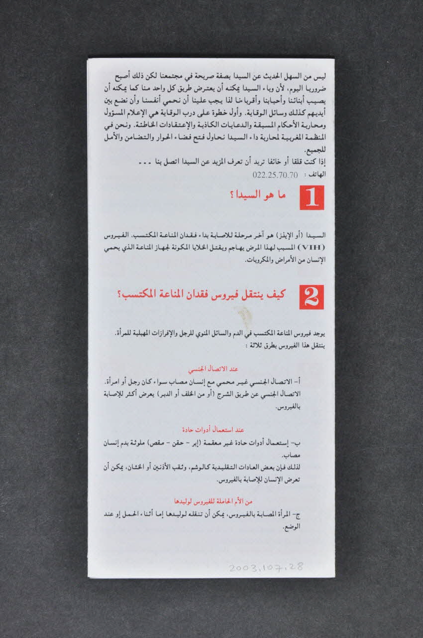 Parler du sida n'est pas facile... Le premier pas sur le chemin de la prévention passe avant tout par l'information, mais aussi par la lutte contre les préjugés, les rumeurs et les fausses croyances. A l'Association Marocaine de Lutte contre le Sida, nous essayons depuis quelques années de créer un espace de parole, de solidarité et d'espoir..., à l'intérieurSous-titre