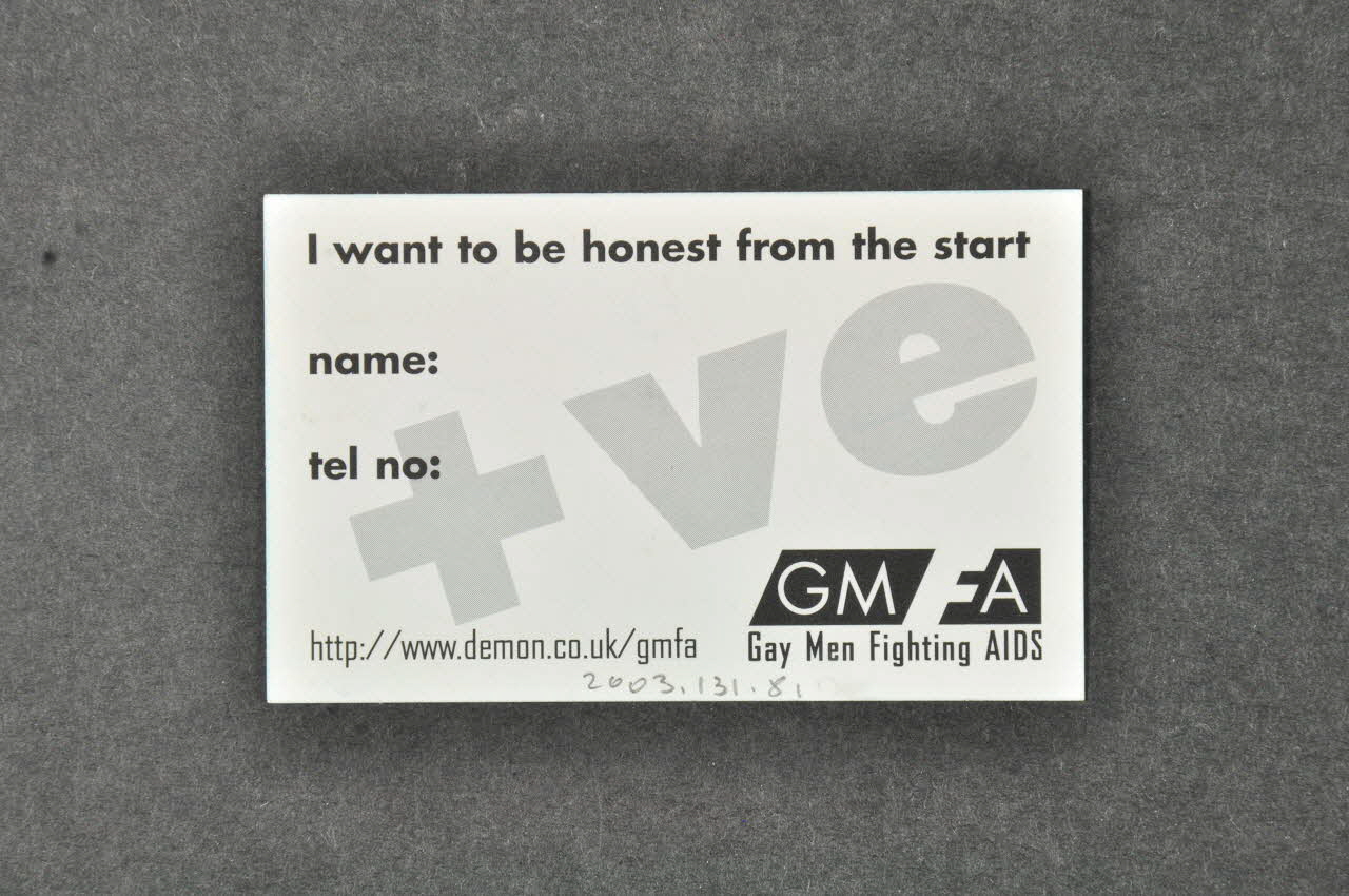 GMFA // Gay Men Fighting AIDS (Dans la partie inférieure, en noir), versoAdresse, nom d'association