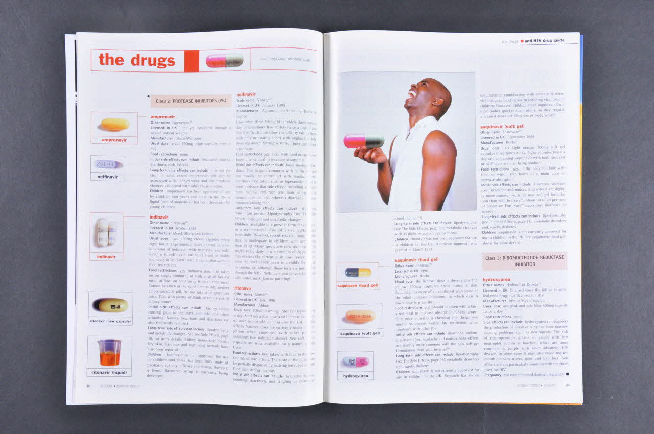 features // His Honour has HIV 6 // Poles apart 16 // Cold hearts in Chile 22 // // THE POSITIVE NATION COMPLETE GUIDE TO ANTI-HIV DRUGS // Part I : The drugs 26 // Part II : The combinaitions 32 // Part III : The interactions 34 // Part IV : The side effects 38 // // treatments // 14 Treatment news // 41 Q&A with the Aids Treatment Project // // regulars // 4 comment // 4 cast list and contact details // 5 letters // 11 news // 42 imagination // 49 virusboy // 51 my dear watson // 53 speak up // 55 love, danny // 56 the gazette // 60 the directory // 62 subscription form // 63 small ads // 66 counter culture (Imprimé en noir sur blanc sur la page 3 et réparti en trois parties dont les intitulés et les pages sont en vert ou rouge ; un encadré rouge distingue le dossier principal des autres articles), à l'intérieurDécor