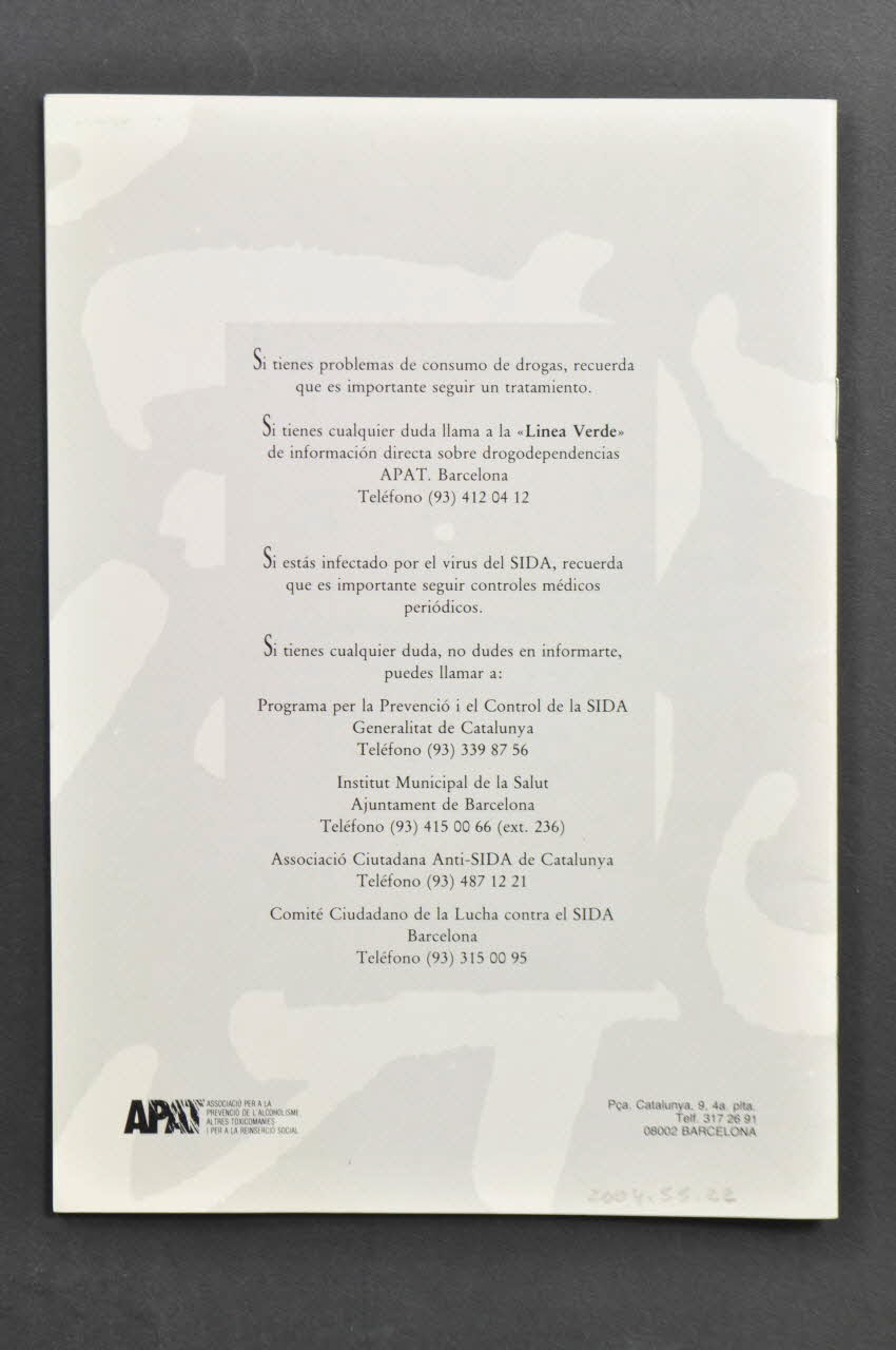 L'intérieur est sur fond blanc et porte des inscriptions en noir et des titres en blanc sur bandeau vert. Le sida est représenté par un petit bonhomme rouge en forme de "S"