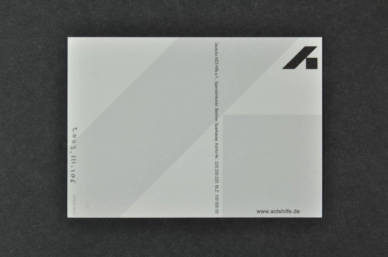 Deutsche // AIDS-Hilfe e.V. (Logo composé de deux traits épais blancs dont le premier est incliné et repose sur le deuxième. A droite, le nom de l'association est imprimé en blanc sur noir et sur deux lignes. Ce logo est situé dans l'angle inférieur droit.), rectoTexte