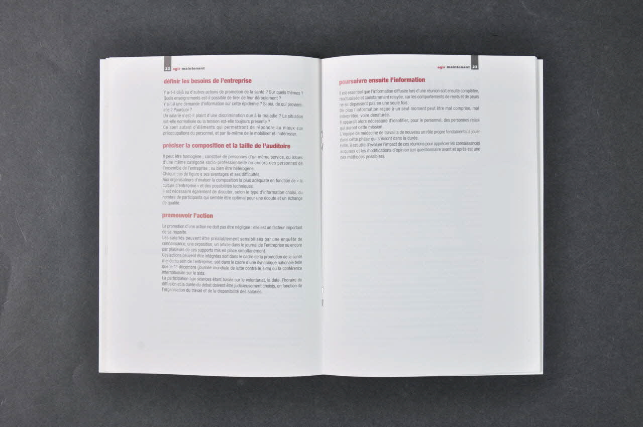 1. Etat de l'épidémie : // l'urgence d'agir // // 2. comprendre l'infection // par le VIH // [...] // // 3. législation // [...] // // 4. agir maintenant // Pourquoi agir au sein de l'entreprise // Comment organiser une action d'information et de sensibilisation au sein de l'entreprise ? // // 5. les outils de prévention dans l'entreprise // 1 documents type // article type pour un journal d'entreprise // questionnaire de sensibilisation // lettre type pour annoncer une action // modèle d'atelier sur le sida // lettre de valorisation // // 2 documents et adresses // [...] // // conclusion // // bibliographie // // annexes (Pages 4 et 5.), à l'intérieurLogo