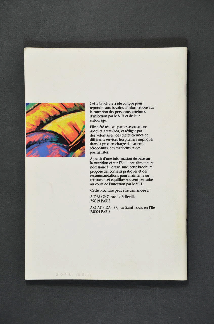 AIDES: 247, rue de Belleville // 75019 PARIS // // ARCAT-SIDA: 57, rue Saint-Louis-en-l'Ile // 75004 PARIS (A la fin du texte, en caractères noirs sur fond blanc), versoAuteur, date