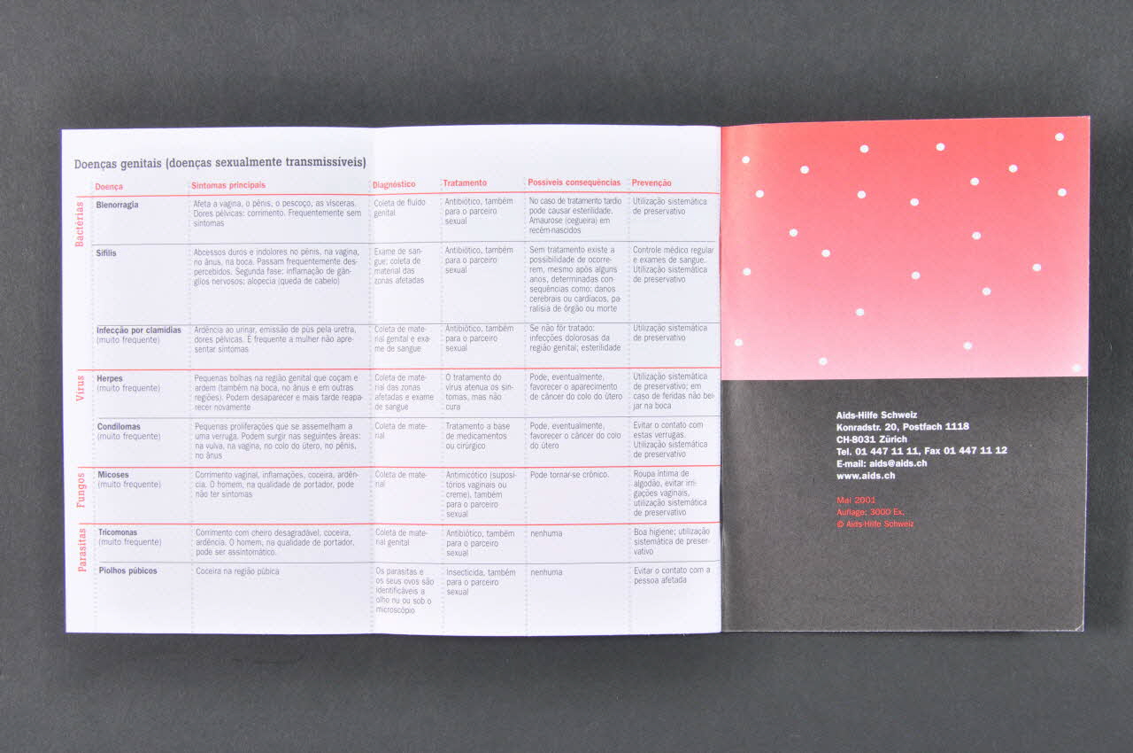 - Aids e outras doenças sexualmente transmissiveis 7 // - O teste VIH 9 // - Hepatite 12 // - Sexo seguro ou... Qual a melhor proteçao para mim nas praticas sexuais ? 15 // - Falemos sobre preservativos 19 // - A tua saude nao é um acaso, tu podes influencia-la! 23 // - Métodos anticoncepcionais 25 // - Doente ! Quem paga ? 29 // - Direitos e deveres - e o que tu tens de saber sobre eles ! 31 // - Sexo, nada de drogas e rola rola rola 43 // - Sobre drogas e o trabalho na area do sex 44 (Imprimé en noir sur fond blanc et rosé, page 5), à l'intérieurSous-titre