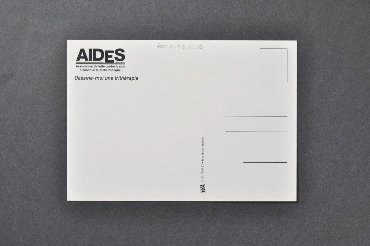 AIDES // Association de lutte contre le sida // Reconnue d'Utilité Publique // // Dessine-moi une trithérapie (angle supérieur gauche), versoSignature, auteur