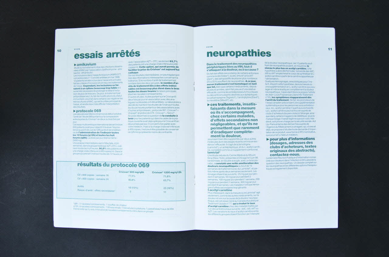 3 REPERES / ETUDE / 4 EP 14S / ESSAIS PEDIATRIQUES / 5 PENTA VII / ESSAIS D'ANTIRETROVIRAUX / 6 NARVAL / 7 PRIMFERON / LYMPHOME / 8 RITUXIMAB / 9 TABLEAU / MOLECULES / 10 ESSAIS / ARRETES / ZOOM / 11 LYMPHOME / 13 NEUROPATHIES / 14 KAZATCHKINE / 18 GLOSSAIRE / 20 LE NERF DE LA / GUERRE (Dans la partie latérale gauche.), sur la couvertureDécor