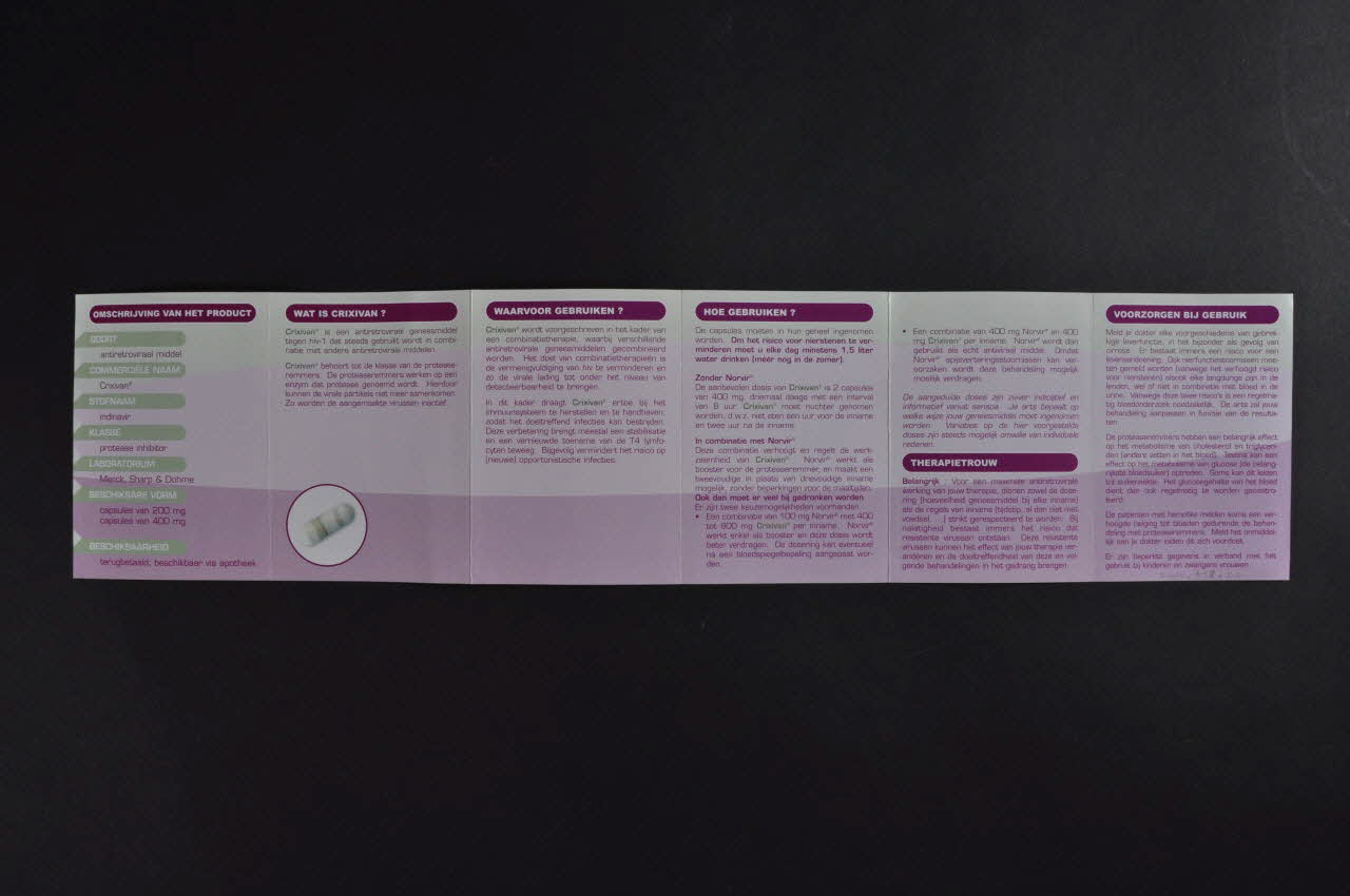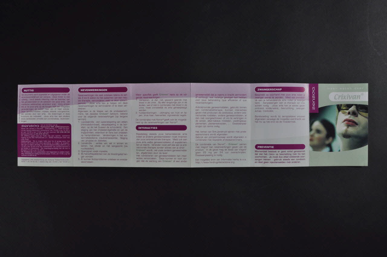 Meer weten over Crixivan (En savoir plus sur Crixivan) (Titre du dépliant en haut de la couverture.)OMSCHRIJVING VAN HET PRODUCT // WAT IS CRIXIVAN ? // WAARVOOR GEBRUIKEN ? // HOE GEBRUIKEN ? // VOORZORGEN BIJ GEBRUIK // THERAPIETROUW // BEWAREN // NUTTIG // NEVENWERKINGEN // INTERACTIES // ZWANGERSCHAP // PREVENTIE (Titres des rubriques du dépliant.)sensoa (Nom de l'association écrit en blanc dans un cartouche bleu en haut à gauche de la couverture.)Décor