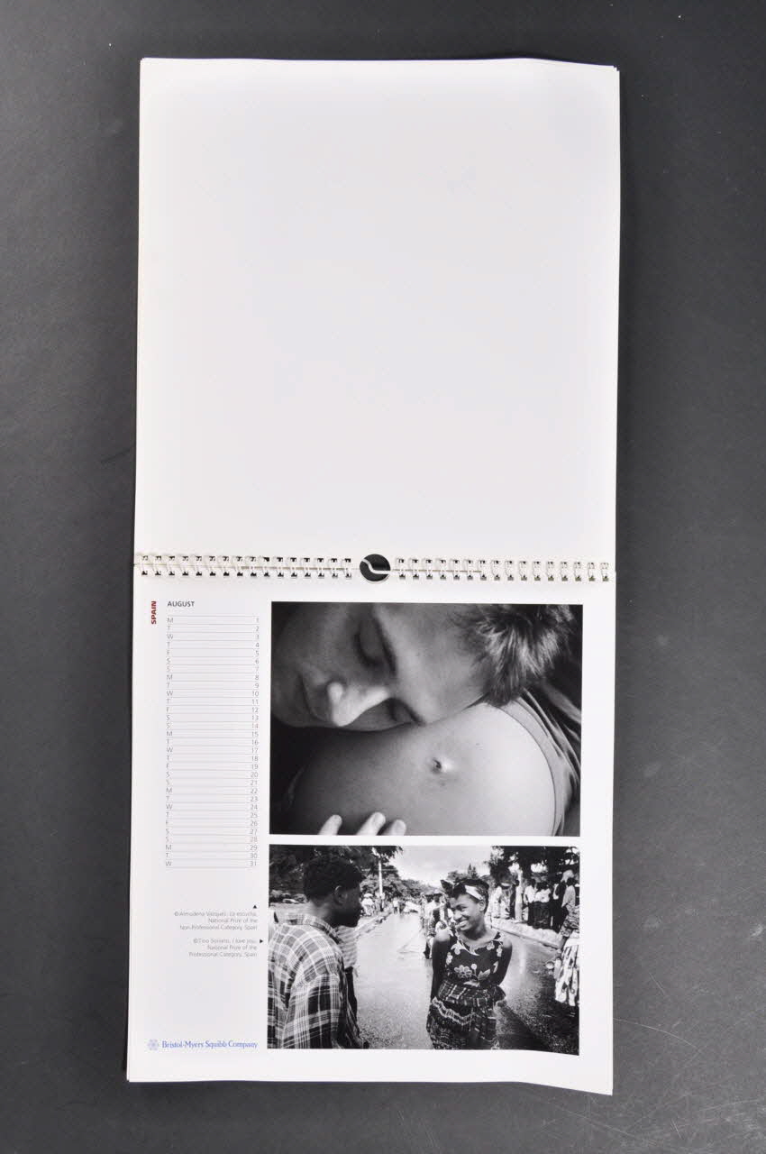 Ce calendrier est fait avec les meilleurs photos ayant obtenu un prix au concours organisé par le laboratoire. Sa vente est destinée à collecter des fonds pour les associations de lutte contre le sida. Janvier : Belgique Luxembourg : Layla Aerts : Famille romaine (enfants et femme enceinte) et Didier Dereck : Balançoire (enfant). Février : Pays Nordiques : Harri Natunen : Mihail (enfant) et Anders Carlsson : Longing eyes (yeux et parapluie) Mars : Italie : Andrea Bellini : Life (père et bébé) (prix, en couverture) et citation de Robert Taylor, président du concours (photos montrant la vie quotidienne de personnes concernées ou non) Avril : France : Hélène Valenzuela : Rires(enfant riant) et Patrick Aventurier : Child with pills (enfant noir avec médicaments) Mai : Allemagne : Ulrich Lindenthal : Keeper of time (homme nu s'habillant, prix) et Walter Fogel : Abflug (homme sautant d'un plongeoir, prix, en couverture) Juin : Allemagne : Walter Fogel : Abflug (homme sautant d'un plongeoir, prix, en couverture) (même photo que mai en pleine page) (citation de Christian SAOUT, AIDES, rendre le sida visible) Juillet : Grèce : Vasileia Chatzicharalampous, Dream 1 (prix, femme en noir) et Natasa Vellini : Experience Hope (fenêtre ouverte) Août : Espagne : Almudena Vasquez : La escucha (prix, écoute du ventre d'une femme enceinte) et Tino Soriano : I love you (deux jeunes se souriant) Septembre : Belgique-Luxembourg, Future Adults (prix, jeunes, en couverture) Octobre : Italie : Daniele Ricci : Hand (mains, prix) et Andrea Bellini : Life (père et bébé) (prix, en couverture cf mars) Novembre : Royaume Uni : Richard Sawdon Smith : Listening to Myself : Closed (homme s'autoauscultant) et Tim Robinson : Touching hands (main de bébé et doigt d'adulte) Décembre : Mireille Marescaux, Hands (mains) et citation sur le 1er décembre d'un des membres du jury Fait partie des objets vendus par National AIDS Trust.