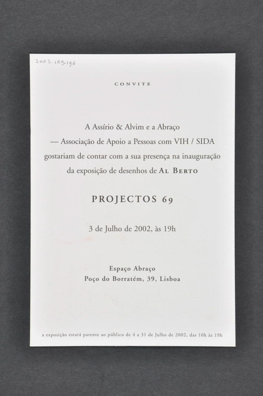 Le recto et le verso se lisent dans le sens horizontal. Le recto, sur fond blanc, se compose dans sa partie supérieure d'un court texte en français en lettres italiques noires. Les deux tiers de la surface sont consacrés à un portrait d'homme dessiné à l'encre noire avec un jeu d'ombres et de lumières. Le texte et le dessin sont encadrés et séparés par des lignes noires. Au recto, sur fond blanc, en caractères noirs, on trouve l'invitation par l'association Abraço à l'inauguration d'une exposition de dessins de Al Berto intitulée "Projectos 69". Il est mentionné dans un court texte le sujet de l'invitation, le titre de l'exposition, la date, et le lieu.Inscriptions