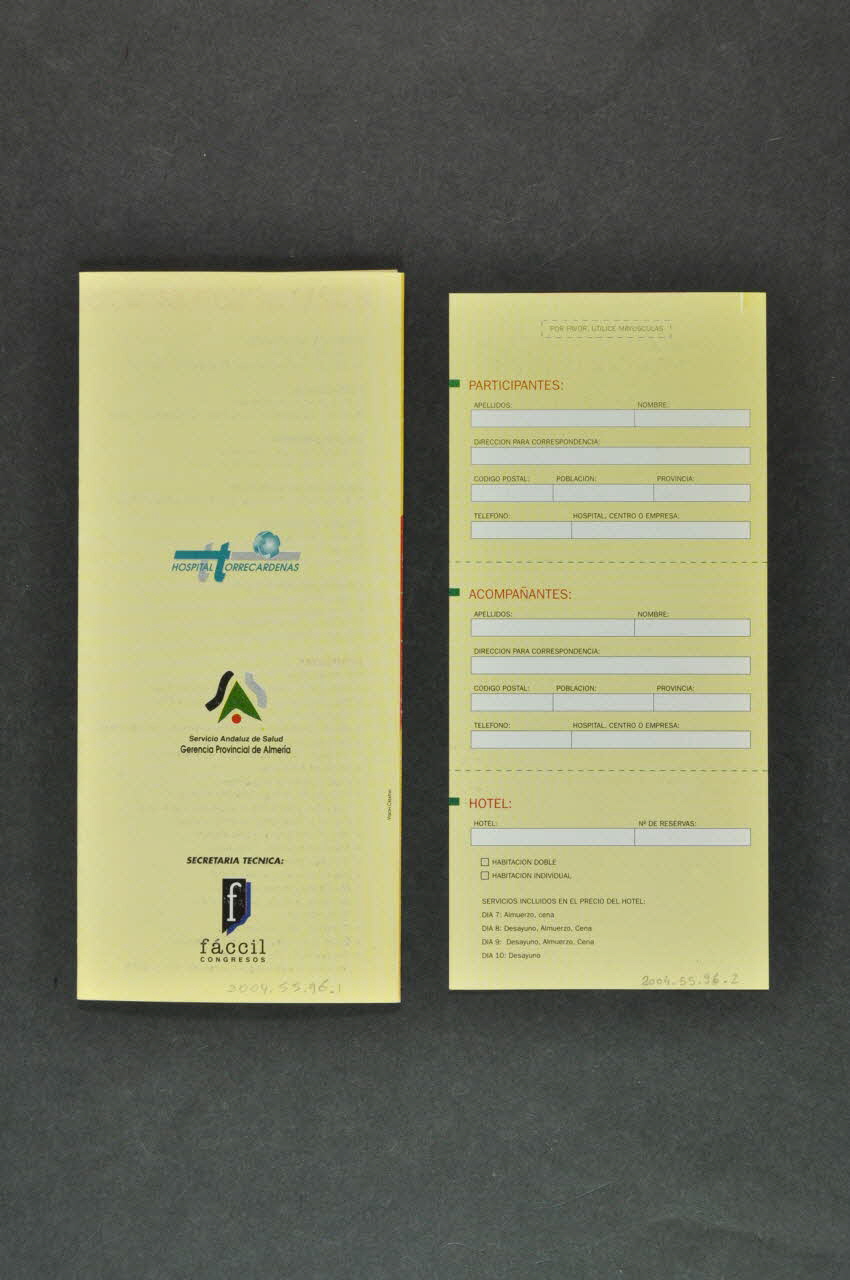 SECRETARIA TECNICAL: // f // faccil // congresos (Logo constitué d'un texte noir en haut et en bas d'un "f" blanc placé dans un bandeau noir ombré de bleu), versoServicio Andaluz de Salud // Gerencia Provincial de Almeria (Logo constitué de quatre formes géométriques colorées : un triangle vert, deux "S" bleu et gris et un rond rouge. Du texte est imprimé en dessous en noir), versoSous-titre, date