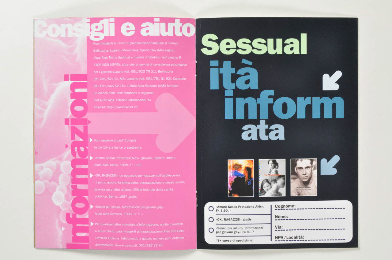 - p.3-4 A gauche en fond, grande photo noir et blanc de deux têtes : une femme blonde embrassant un homme brun. Aucune impression sinon les débuts des titres de paragraphes. A droite, fond noir, impression en blanc. En haut, à droite, petite vignette noir et blanc avec les mêmes personnages, l'homme enlaçant la femme et tenant un préservatif. Titres à cheval sur les deux pages.