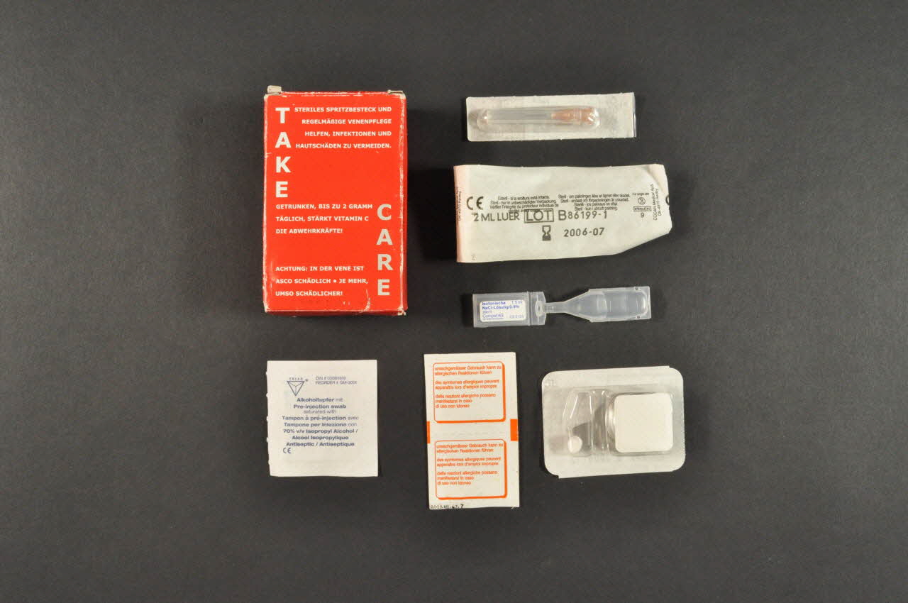 Le kit se compose d'une boîte carton de forme parallélépidédique avec des impressions en couleurs et une illustration d'une seringue sur la face principale, au verso apparait un texte en lettres capitales blanches et en allemand. A l'intérieur de la boîte on retrouve une séringue graduée en plastique dans son emballage, une aiguille stérile en métal, du sérum physiologique, une coupelle métallique stérile dans son emballage, un tampon emballé et des lingettes à la vitamine C dans leurs emballages. Ce kit a été réalisé dans le cadre du projet "Safer Use" de la Deutsche AIDS-Hilfe.Inscriptions