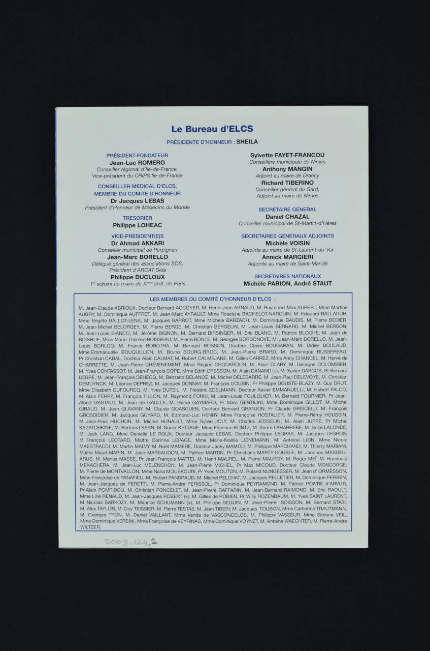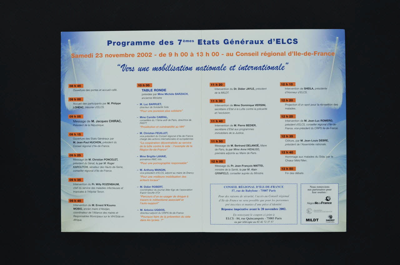 Programme des 7èmes Etats Généraux d'ELCS // Samedi 23 novembre 2002 - de 9h00 à 13h00 - au Conseil régional d'Ile-de-France // [...] // 9h Accueil par Philippe Loheac, trésorier // 9h05 Message de M.Jacques Chirac // 9h15 Ouverture par Jean-Paul Huchon, président du Conseil régional d'Ile-de-France // 9h 25 Message de Christian Poncelet, président du Sénat // 9h 35 Intervention de Willy Rozenbaum, chef du service des maladies infectieuses et tropicales à l'Hôpital Tenon 9h 45 Intervention de Ernest N'Koumo Mobio, ancien maire d'Abidjan, coordinateur de l'Aliance des maires et responsables municipaux sur le VIH/sida en Afrique. // 10 h Table ronde présidée par Michèle Barzach, ancienne Ministre : Luc Barruel, directeur de Solidarité Sida : Pour une jeunesse plus solidaire / Camille Cabral, conseillère du 17° arrondissement de Paris, directrice du PASTT : Prostitution et vulnérabilité au VIH / Christian Feuillet, vice-président du Conseil régional d'Ile-de-France chargé des actions internationales et européennes : La coopération décentralisée au service de la lutte contre le sida : l'exemple de la Région Ile-de-France / Brigitte Lahaie, animatrice RMC info : Pour une pornographie responsable / Anthony Mangin, vive-président d'ELCS, adjoint au maire de Drancy : Pour une meilleure mobilisation des élus locaux / Didier Robert, coordinateur du journal Alter Ego de l'association Espoir Goutte dOr : Parcours d'un ex-usager de drogue à travers le militantisme associatif et l'auto-support / Antonio Ugidos, directeur-adjoint du CRIPS Ile-de-France : Pourquoi faire de la prévention du sida dans les lycées ? // 11h20 Intervention de Didier Jayle, président de la MILDT 11h30 Intervention de Mme Dominique Versini, secrétaire d'Etat à la Lutte contre la précarité et l'exclusion // 11 h 40 Intervention de Pierre Bedier, secrétaire d'Etat aux programmes immobiliers de la Justice // 11 h 50 Message de Bertrand Delanoë, maire de Paris // 12 h Message de Jean-François Mattéi, ministre de la Santé // 12 h 10 Intervention de Sheila, présidente d'Honneur d'ELCS // 12 h 20 Projection d'un spot pour la réinsertion des malades // 12 h 25 Intervention de Jean-Luc Romero, président d'ELCS, conseiller régional d'Ile-de-France, vice-président du CRIPS Ile-de-France // 12h35 Clôture par Jean-Louis Debré, président de l'Assemblée Nationale // 12h40 Hommage aux malades du Sida par le choeur Malo'Men // 12 h 50 Fin des débats. (programme sur 4 colonnes, sur les deux feuillets intérieurs), à l'intérieur