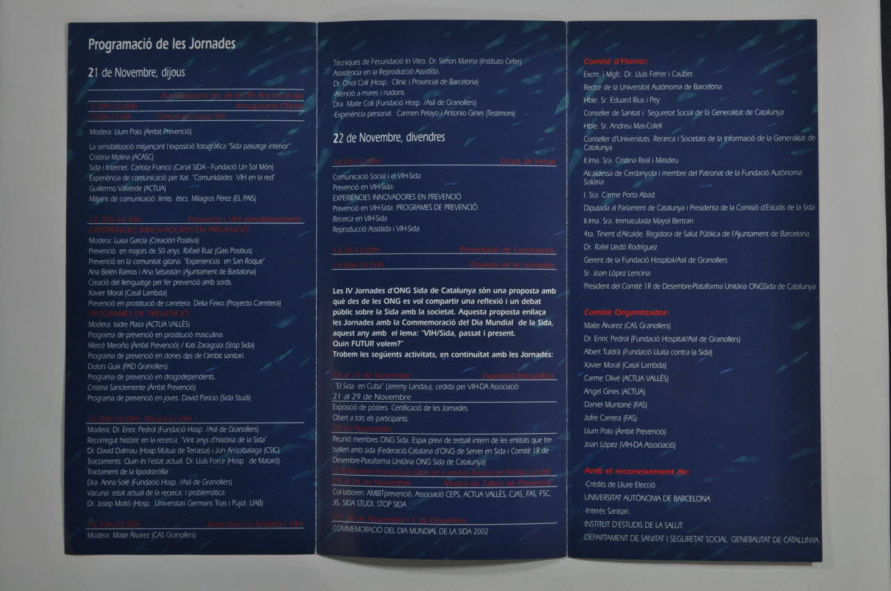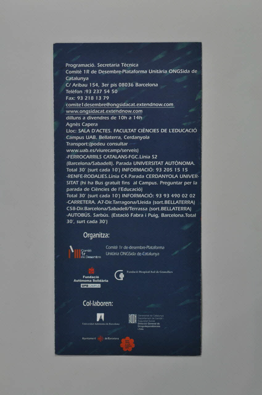 Organitza: // // Comité // 1r // de Desembre // // Fundació Autonoma Solidària // UB CAMPUS // // Fundació Hospital/Asil de Granollers // // Col-laboren: // // Universitat Autonoma de Barcelona // // Generalitat de Catalunya // Departament de Sanitat i // Seguretat Social. // Direcció General de Drogodependències i Sida // // Ajuntament de Barcelona (La partie inférieure du dos du dépliant est rythmée par divers logos d'organisation.), versoSommaire