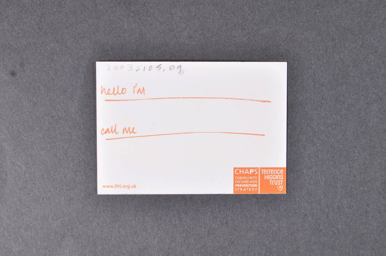 Au recto, on peut voir une photo de graffiti brun sur fond de décor de toilettes (tuyau rouillé, papier toilettes...). Au verso, en italiques brunes sur fond crème se trouvent des mots en anglais suivis de traits afin qu'on laisse ses coordonnées. Cette carte était laissée à portée des gens dans les bars pour laisser son adresse. Il s'agit d'une campagne spécifique pour les hommes homosexuels.Inscriptions