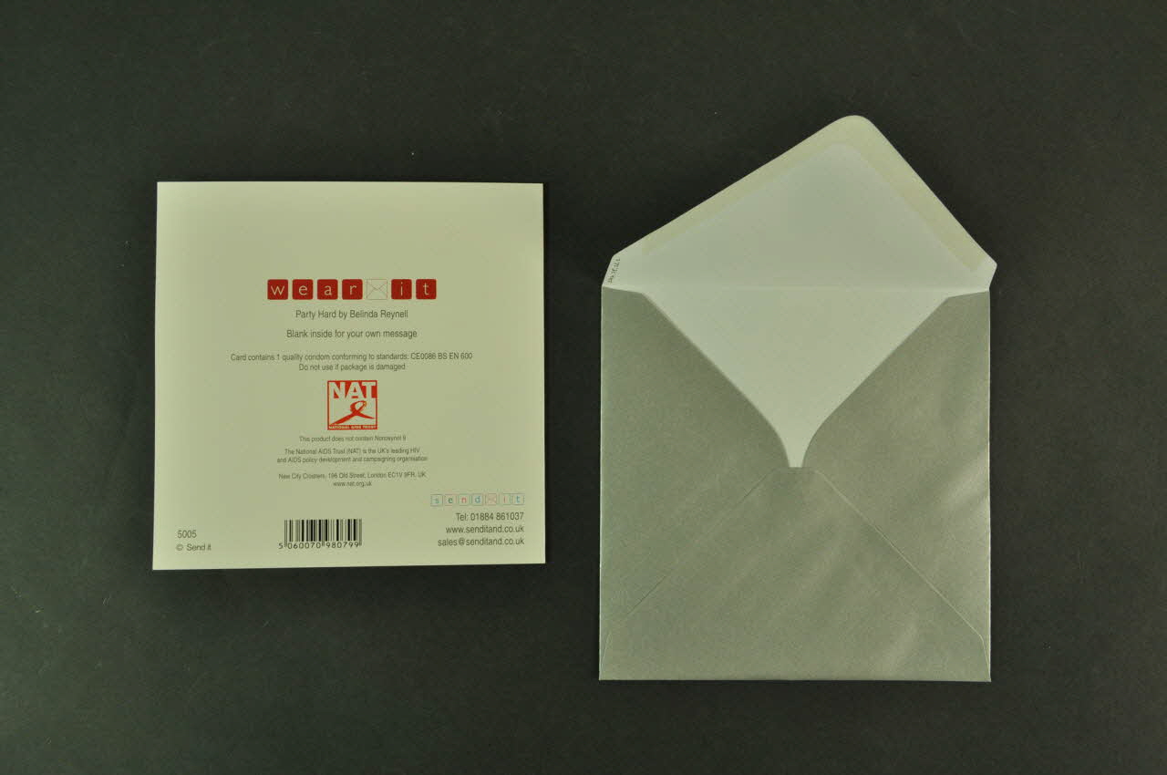(wear it // // Party Hard by Belinda Reynell // // Blank inside for your own message // // Card contains 1 quality condom conforming to standards // Do not use if package is damaged), versoSlogan, adresse