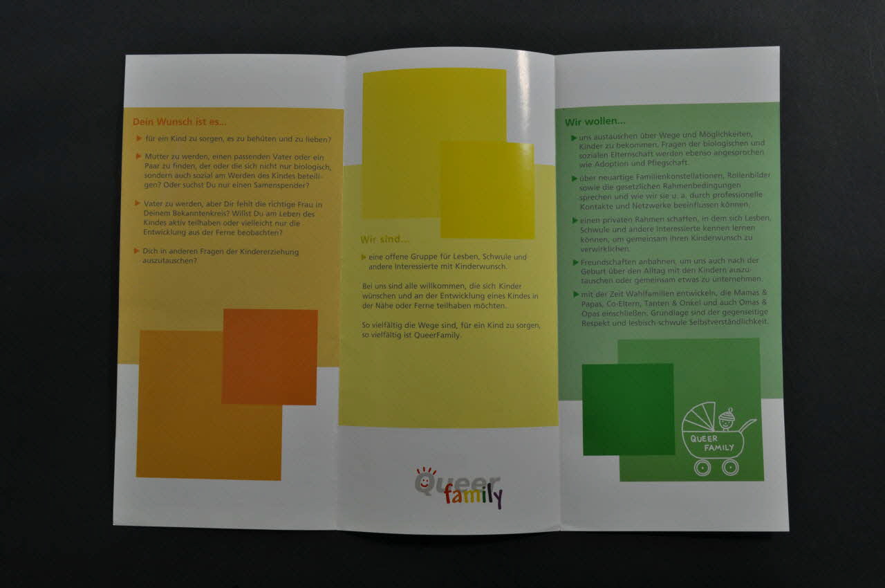 Initiative für Lesben, Schwule // und Andere mit Kinderwunsch // und kindern (de l'avant du dépliant, sur cadre orange), en hautSlogan