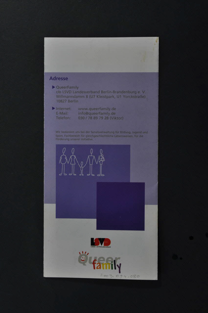 LSVD // Lesben- und Scwulenverband (du verso au centre, en rouge et noir), en basQueer // family (du recto et du verso du dépliant, en gris pour le premier mot et lettres multicolores pour le second), en basSous-titre