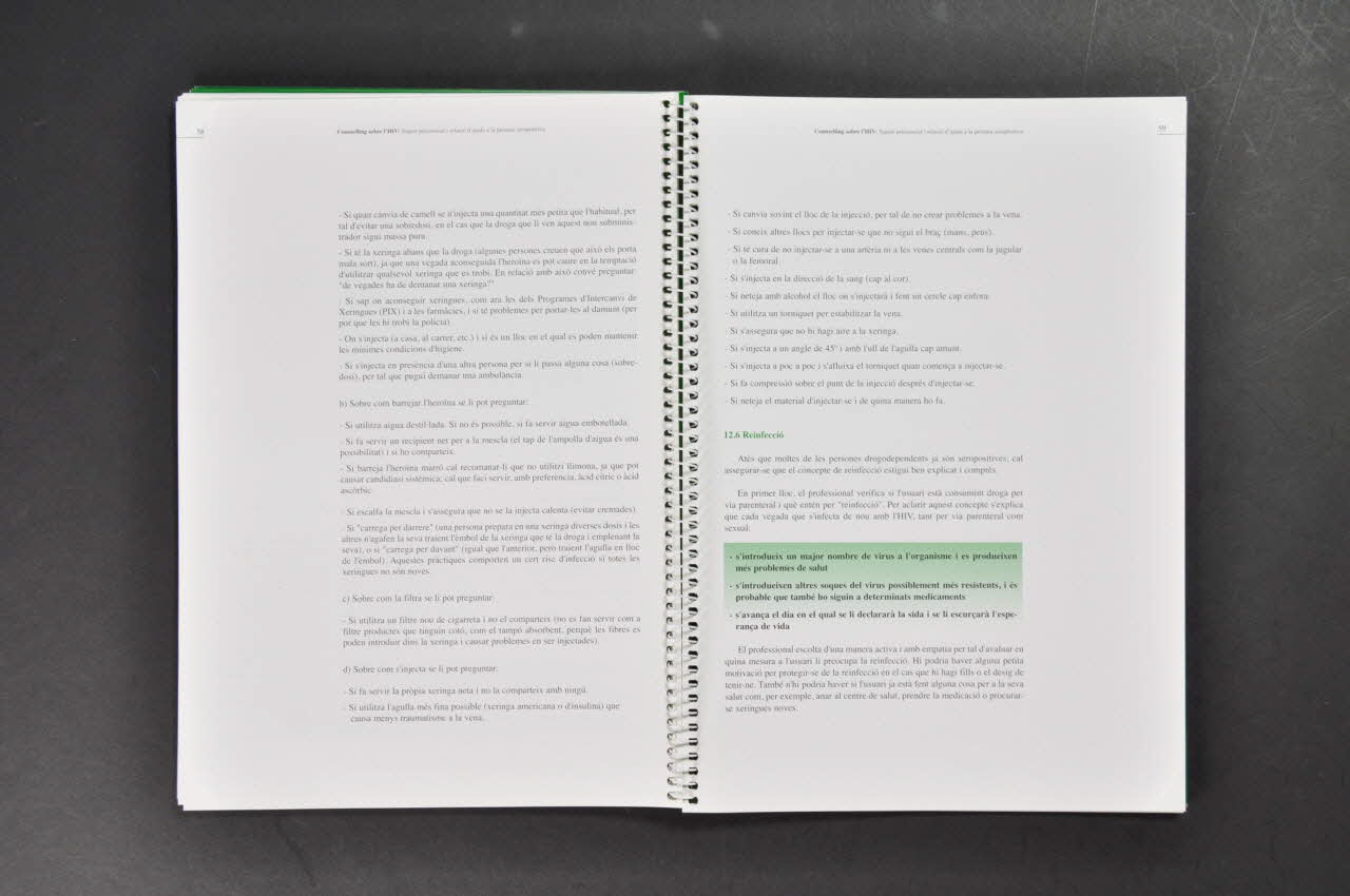 Prolèg (pag. 10) // 1. Introduccio (pag. 10) // [...] // 2. Actituds (pag. 16) // [...] // 3. Escolta activa (pag. 18) // [... // 4. Impacte emocional de l'HIV (pag. 22) // [...] // 5. Por i HIV (pag. 25) // [...] // 6. Rabia i HIV (pag. 29) // 7. Necessitats de la persona seropositiva (pag. 31) // [...] // 8. Decisions amb reflexio : aclarir els problemes i informar sobre les opcions (pag. 35) // [...] // 9. Prova d'anticossos (pag. 37) // [...] // 10. El primer any després del diagnostic (pag. 43) // [...] // 11. Decisions sobre tractaments i proves (pag. 48) // [...] // 12. Seropositivitat i drogodependència (pag. 53) // [...] // 13. Dona i HIV (pag. 61) // [...] // 14. Sexe i HIV (pag. 66) // [...] // 15. Nens i HIV (pag. 74) // [...] // 16. Familia i entorn (pag. 84) // [...] // 17. Mort i dol (pag. 91) // [...] // 18. Millora de la salut : un nou repte (pag. 97) // [...] (Imprimé en noir et vert sur blanc sur les pages 6 et 7), à l'intérieurSous-titre