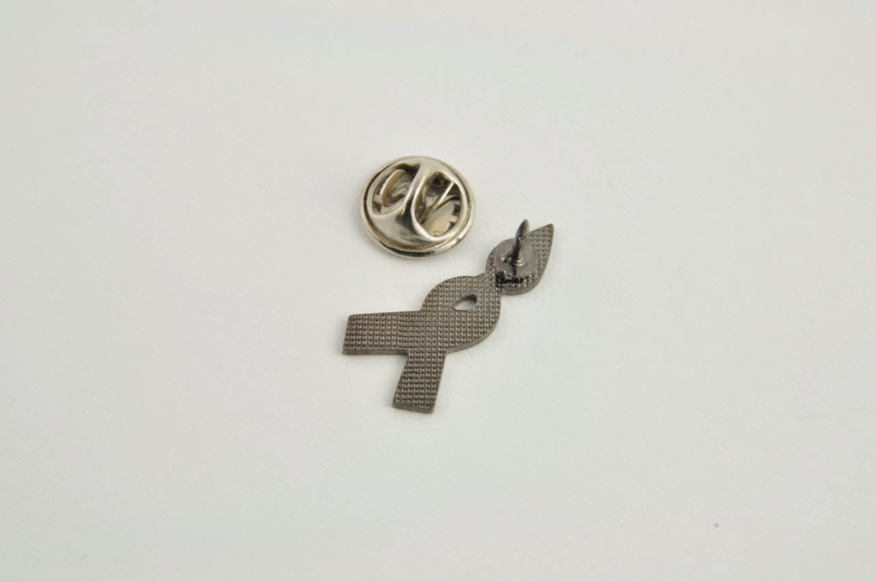 Métal moulé émaillé. / Pin's en métal gris émaillé, prenant la forme d'un petit ruban rouge, surmonté d'une petite flamme.Décor