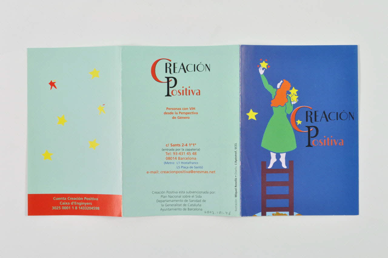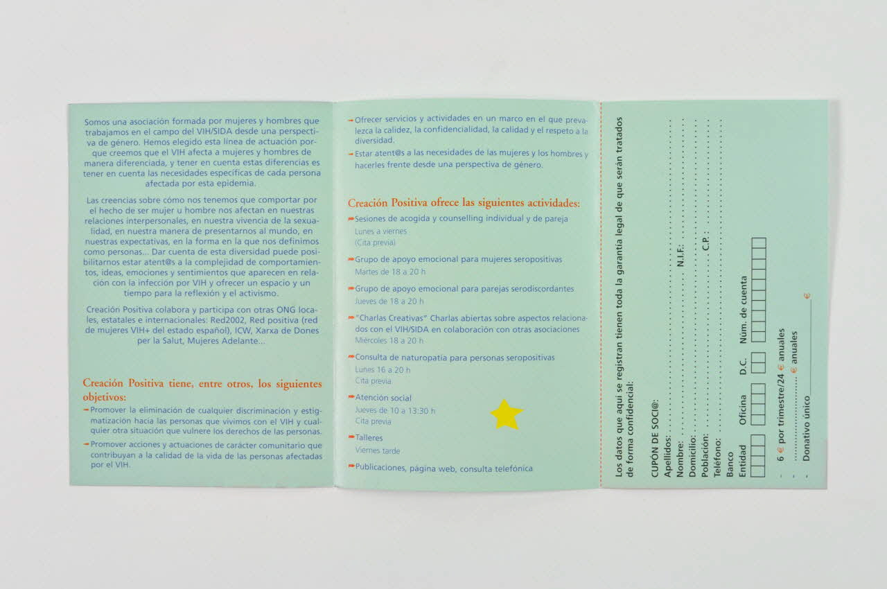 Cuenta Creacion Positiva / Caixa d'Enginyers / 3025 0001 1 8 1433204598 (Inscription en vert clair sur une bande rouge dans le bas du plus petit des volets.), à l'intérieurLos datos que aqui se registran tienen toda la garantia legal de que seran tratados / de forma confidencial : / CUPON DE SOCI@ : / Apellidos : ............... / Nombre : ............ / N.I.F. : ................. / Domicilio : ..................... / Poblacion : ....................... / C.P. : ................. / Teléfono : ............................................. / Banco / Entidad Oficina / D.C. Num. de cuenta / 6 ¤ por trimestre/24 ¤ anuales / .................¤ anuales / Donativo unico .................. ¤ (Sur le feuillet la plus à droite, à l'intérieur, bulletin d'abonnement imprimé en noir avec des champs en pointillés à remplir.), à l'intérieurSomos una asociacion formada por mujeres y hombre que / trabajamos en el campo del VIH/SIDA desde una perspectiva de género. [...] (Texte imprimé sur fond vert clair avec une inscription bleue à titres rouges.), à l'intérieurCREACION / Positiva / Personas con VIH / desde la Perspectiva / de Género / c/ Sants 2-4 1°1a / (entrada por la zapateria) / Tel : 93-431 45 48 / 08014 Barcelona / (Metro : L1 Hostafrancs / L5 Plaça de Sants) / e-mail : creacionpositiva@eresmas.net (Inscription en noir et rouge, au dos, avec la mention sur les metros en bleu.), versoDécor