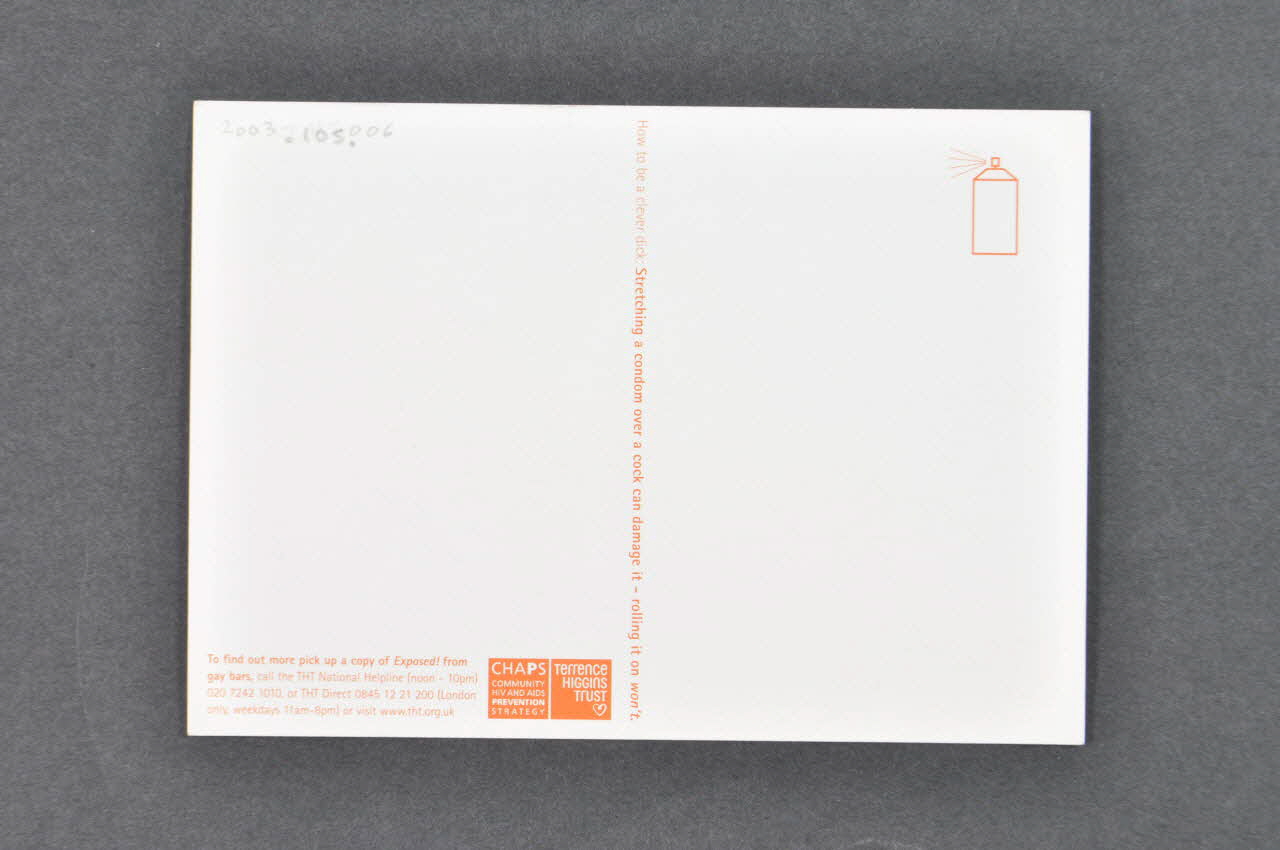 How to be a clever dick : Streching a condom over a cock can damage it - rolling it on won't (Inscription imprimée en orange, verticalement, au milieu pour couper le dos de la carte en deux.), versoCHAPS / COMMUNITY / HIV AND AIDS / POREVENTION / TRATEGY / // TERRENCE / HIGGINS / TRUST (Présence de deux carrés orange portant les logos de deux association imprimés en blanc.), versoTo find aut more pick up a copy of Exposed ! from / gay bars, call the THT National Helpline (noon-10pm) / 020 7242 1010, or THT Direct 0845 12 21 200 (London / only, weekdays 11am-8pm) or visit www.tht.org.uk (Petite inscription imprimée dans le dos de la carte, en bas de la partie gauche.), versoDécor