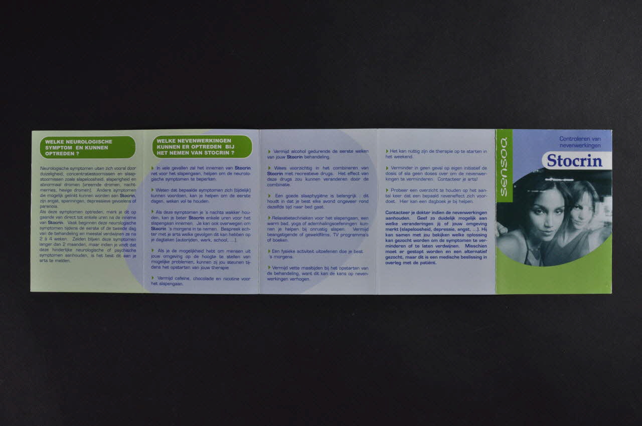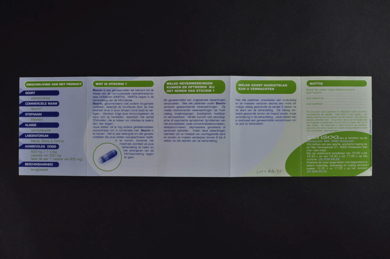 Controleren van nevenwerkingen Stocrin" (Compléments d'information sur Stocrin??) (Titre du dépliant en haut de la couverture.)OMSCHRIJVING VAN HET PRODUCT // WAT IS STOCRIN ? // WELKE NEVENWERKINGEN KUNNEN ER OPTREDEN BIJ HET NEMEN VAN STOCRIN ? // WELKE SOORT HUIDUITSLAG KAN U VERWACHTEN // NUTTIG // WELKE NEUROLOGISCHE SYMPTOM EN KUNNEN OPTREDEN? // WELKE NEVENWERKINGEN KUNNEN ER OPTREDEN BIJ HET NEMEN VAN STOCRIN? (Titres des rubriques du dépliant.)sensoa (Nom de l'association écrit en blanc dans un cartouche vert en haut à gauche de la couverture.)Décor