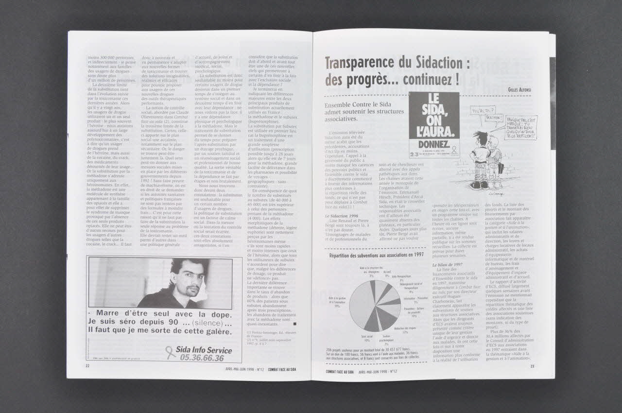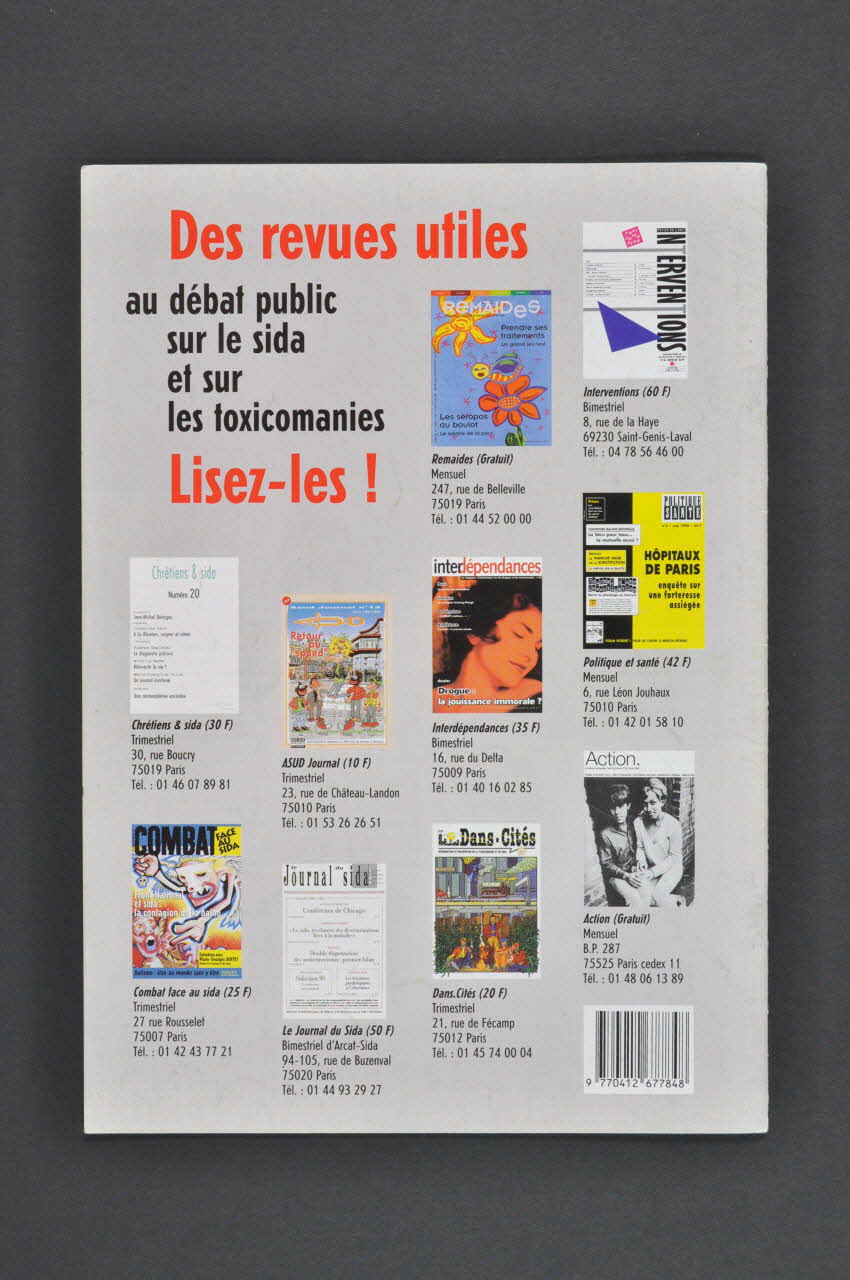 Résumé: p. 4-6 Entretien avec Marie-Georges Buffet, ministre de la jeunesse et des Sports, Jeunes et politique : l'invitation à la citoyenneté ("Comment imaginer que le ministère qui se veut l'interlocuteur des jeunes ne se préoccupe pas du sida? C'est la préoccupation majeure des jeunes avant l'emploi et le ministère intervient souvent dans des demandes de prévention primaire. Nous travaillons avec des associations de lutte contre le sida sur des documents de prévention") p. 7-8 Enjeux (Sondage sur le dépistage; subutex; handicapés mentaux, sexualité et VIH, désir d'enfant) p. 8 Philippe Mangeot, Les priorités d'Act Up-Paris (information thérapeutique, santé publique et répression, toxicomanie, lien avec les associations des pays du Sud) p. 9-14 Gilles Alfonsi Autisme : être au monde sans y être (travail photographique d'Eric Dexheimer , rien sur le sida) p. 15-19 Document : Loi de 1970 le texte et le débat (publication intégrale du texte de la loi, appel à la manifestation le 7 juin : "Drogues, légalisez le débat", avec Act Up-Paris, ACCs, Aides, ASUD, Chiche, CIRC, CORA, Editions du Lézard, L'Elephant Rose, les verts, LDH, PRG, Réseau Voltaire, Syndicat de la Magistrature, Techno Plus...) p. 20 Jean-Luc Guilhem, Les toxicomanies, entre le spécial et le banal (présentation du n° spécial) p. 21-2 Bruce Pakinch, Substitution à la méthadone : entre diabolisation et angélisme (témoignage, problème du manque d'infrastructures) p. 23-4 Gilles Alfonsi Transparence du sidaction : des progrès... continuez ! (progrès dans la transparence, gaffe de l'affiche "Le sida, on l'aura. Donnez" p. 24 Philippe Stierlin, Sida, la lutte continue (AG de l'ACCS) p. 25-31 Dossier : Front National et Sida. La contagion de la haine (discours sur le sida du Front National) - Gilles Alfonsi La peste brune et le sida (discours lepéniste, détournement des incertitudes médicales, mise en question du préservatif, photo de l'affiche interdite en janvier et juillet 91 Socialisme, Immigration, Drogue, Affairisme - Patrick Silberstein, La conquête du pouvoir selon Bruno Mégret p. 32-4 Hélène Amblard, Algérie : l'obscurantisme allié du sida ( tabou, situation économique comme facteur de risque, silence, rôle de la religion) p. 34-5 Rencontre à trois voies (premier court métrage d"Agnès Deurveilher ; Un champ d'amour)