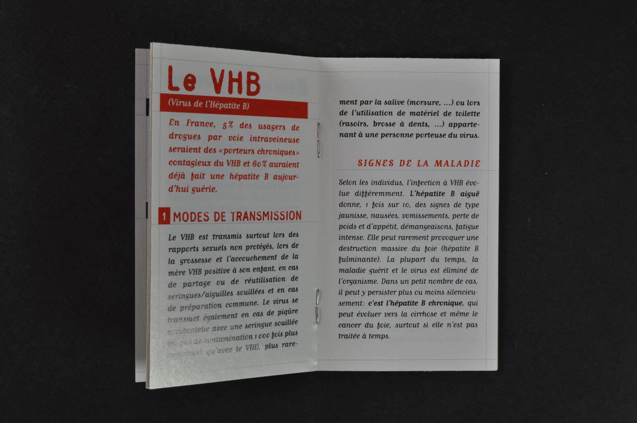 Concernant le dépistage du VIH, VHB et VHC, sachez que le test est anonyme et gratuit quand il est réalisé dans les Centres de Dépistage Anonyme et Gratuit (CDAG) et il est confidentiel et remboursé à 100 % quand il est réalisé dans un laboratoire de ville, sur prescription médicale (Dernière page, en gras sur fond orange :)SIDA / HEPATITES B et C. / Les Risques, la Prévention, / les Symptômes, les TraitementsLe VHB // "En France, 5 % des usagers de drogues par voie intraveineuse seraient des "porteurs chroniques" contagieux du VHB et 60% auraient déjà fait une hépatite B aujourd'hui guérie" // 1 Modes de transmission et signes de la maladie // 2 Prévention // 3 Dépistage (Second chapitre sur l'hépatite B.)Les usagers de drogues par voie intraveineuse sont proportionnellement 400 fois plus touchés par le VIH que les hétérosexuels et 5 fois plus que les homosexuels et représentent en France un quart des cas de sida. // 1 Modes de transmission // 2 Prévention // 3 Traitement de l'accident de prévention // 4 Dépistage et diagnostic précoce // 5 Evolution de l'infection (Premier chapitre sur le VIH.)Ce manuel est destiné aux personnes / qui consomment des drogues injectables (Sous-titre sur la couverture.)Le VHC // En France, on estime que 70% des UDIV sont séropositifs au VHC // 1 Modes de transmission // 2 Prévention // 3 Dépistage (Troisième chapitre sur l'hépatite C.)Décor