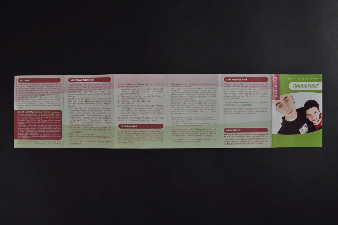 Meer weten over Agenerase (Titre du dépliant en haut de la couverture.)sensoa (Nom de l'association écrit en blanc dans un cartouche en haut à gauche de la couverture.)OMSCHRIJVING VAN HET PRODUCT // WAT IS AGENERASE ? // WAARVOOR GEBRUIKEN ? // HOE GEBRUIKEN ? // VOORZORGEN BIJ GEBRUIK // THERAPIETROUW // BEWAREN // NUTTIG // NEVENWERKINGEN // INTERACTIES // ZWANGERSCHAP // PREVENTIE (Titres des rubriques du dépliant.)Décor