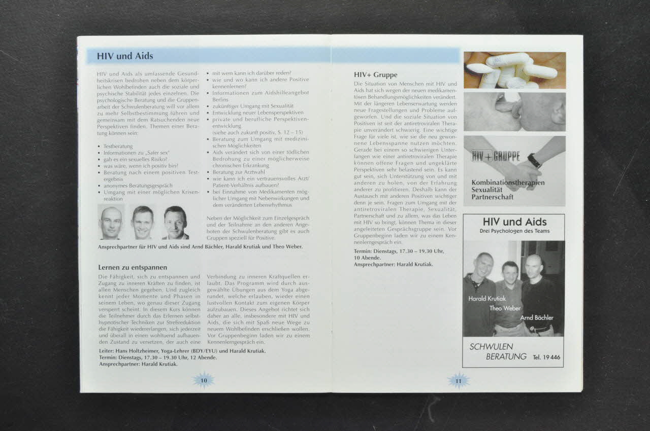 Il s'agit de deux associations à la même adresse. Zukunft positiv semble être une filiale de Schwulen Beratung . Les activités de "Schwulen Beratung" concernent de façon générale les homosexuels : contact anonyme ou personnalisé, coming out et groupe de parole sur le coming out, conseils juridiques, alcooliques anonymes, "sucht" (traduire), handicap (photo), problèmes psychiatriques, estime de soi... Trois programmes sont réservés au VIH/Sida (p.10-11) : informations et conseils de toute sorte (safer sex, test de dépistage, traitements....) / Cours de yoga / Groupe de parole pour les personnes séropositives. p. 12 à 15 Présentation de Zukunft positiv : grpupe qui s'appelait autrefois "Aids & arbeit" (Sida et travail) mais qui a changé de nom car il a élargi son domaine à l'intégration sociale (et non uniquement au travail) des personnes séropositives. (vérifier la traduction). Les activités sont : le conseil : comment vivre avec, les traitements...le soutien psychologique, un groupe de parole, un séminaire d'orientation et de requalification professionnelle. En dernière page : graphiques de bilan pour l'année 1998.