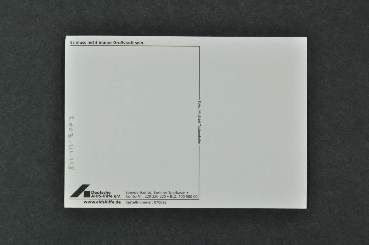 Deutsche // AIDS-Hilfe e.V. (Logo composé de deux traits épais noirs dont le premier est incliné et repose sur le deuxième. A droite, le nom de l'association est imprimé en noir sur deux lignes. Ce logo est situé dans l'angle inférieur gauche), versoDécor