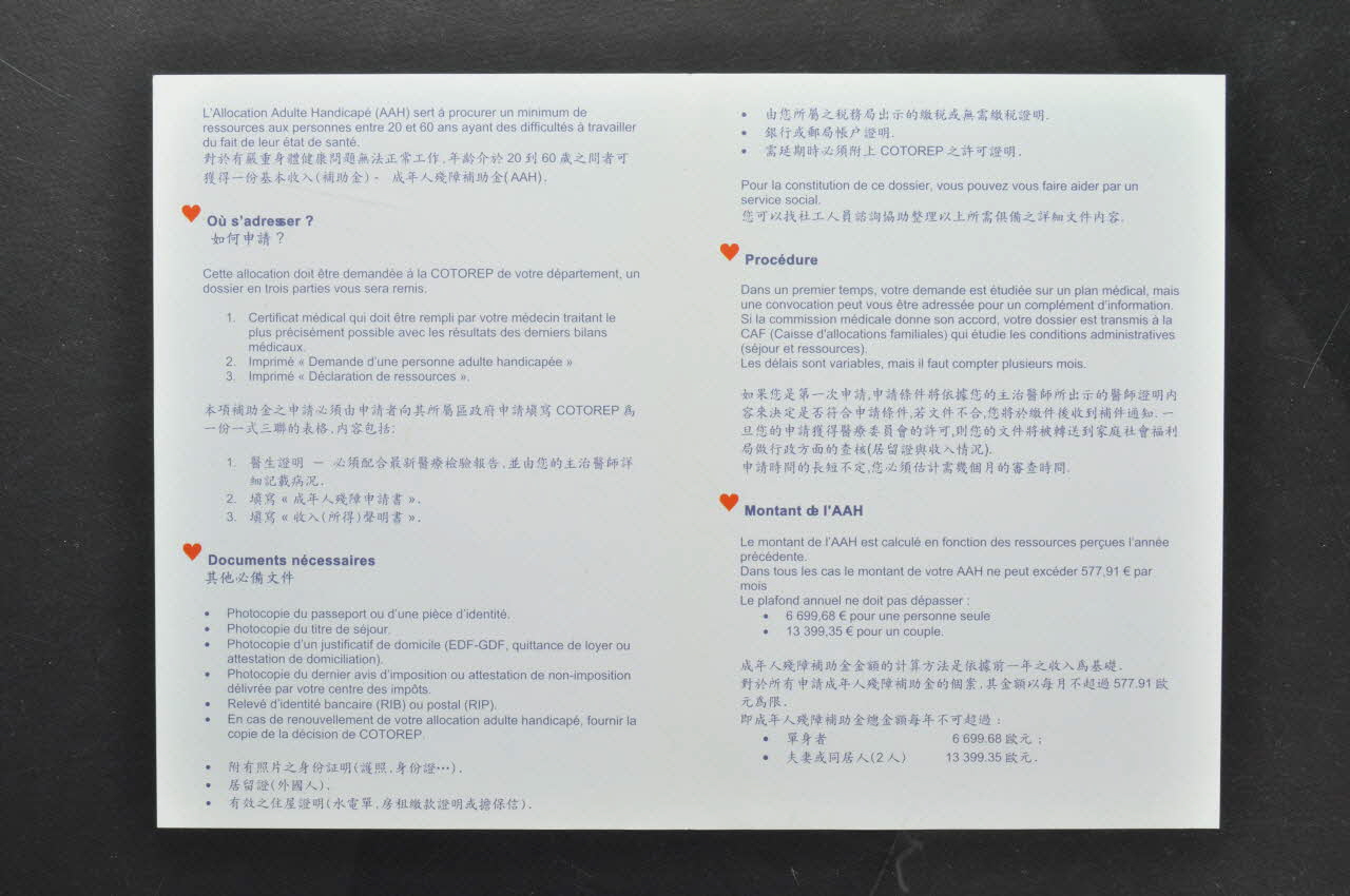 Dépliant, Fiche sociale n°7 "L'allocation Adulte Handicapé (AAH)" (en chinois)