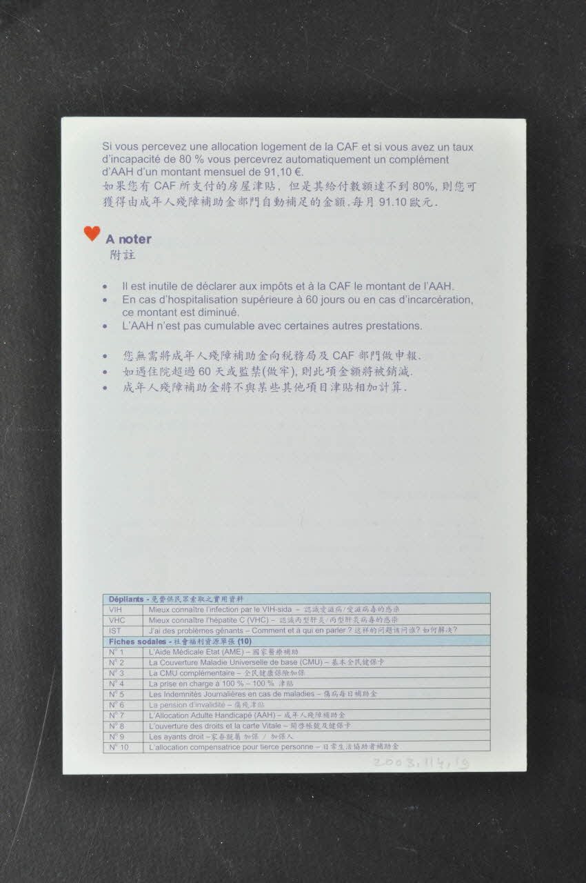 Collecté par F. Loux aux Solidays 2003 (stand de l'association) Série de brochures bilingues chinois français destinées aux migrants d'origine chinoise. Le texte en chinois figure sous chaque titre, sous titre ou paragraphe. Sur la première page intérieure en guise d'introduction, on peut lire: "L'allocation Adulte Handicapé (AAH) sert à procurer un minimum de ressources aux personnes entre 20 et 60 ans ayant des difficultés à travailler du fait de leur état de santé"