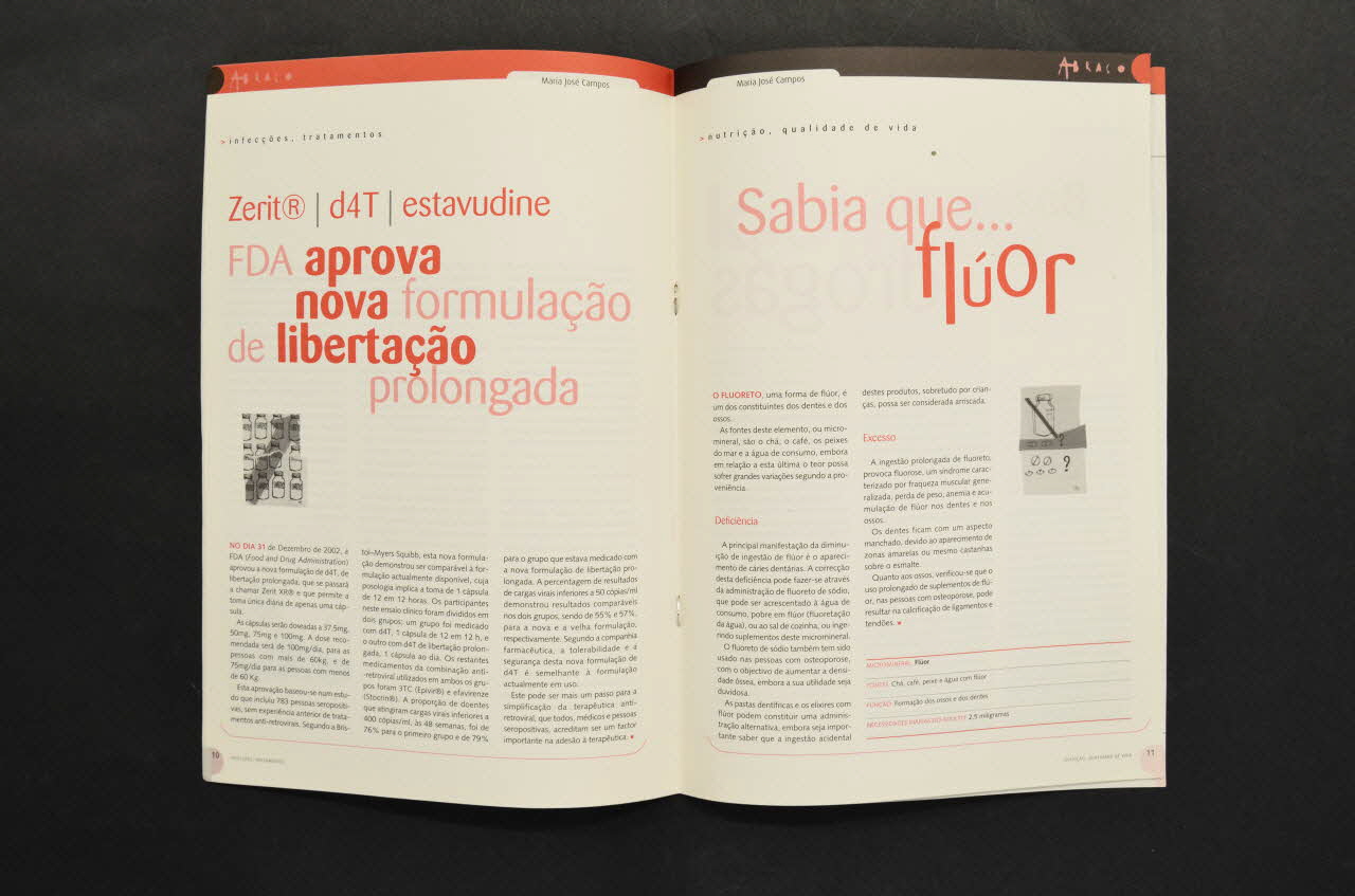 Tirage à 20.000 exemplaires / p. 1-2 Editorial. Sur l'ambiguité de la campagne de la commission nationale du sida Portigaise qui interprète les mots d'ordre de la journée mondiale du Sida : "Vivre et laisser vivre" en "Faisons tomber le masque" comme si c'était aux séropositifs de se dévoiler. p. 3 Sur la notification obligatoire de VIH/Sida p. 3-5 Politiques de diagnostic et d'enregistrement des cas de VIH en France et en Italie. recommandations du Conseil national du Sida p. 5 Maria Jose Campos. Sexe oral et risque de transmission du VIH p. 6-9 Nouvelles de Barcelone 3° partie p. 10 Le Zérit : un pas vers une simplification des thérapeutiques p. 11 Informations sur le fluor p. 12 Bonnes pratiques dans l'usage de drogues p. 13 Maria Jose Campos Informations sur la Kétamine p. 14-17 Le rôle des ONg dans la lutte contre le sida (Ignorance systématique de leur rôle par le Portugal) p. 18 Le centre Mario Pimenta créé par Abraço à Setubal p. 19 Glossaire p. 20 Recette p. 20 Calendrier
