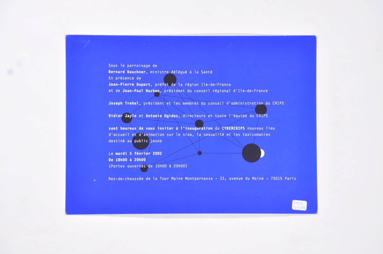 Le recto présente un fond noir avec quelques ronds bleus au centre et plusieurs inscriptions blanches. Le verso présente un fond bleu avec quelques ronds noirs reliés entre-eux. Un texte blanc en six paragraphes est présent.Inscriptions