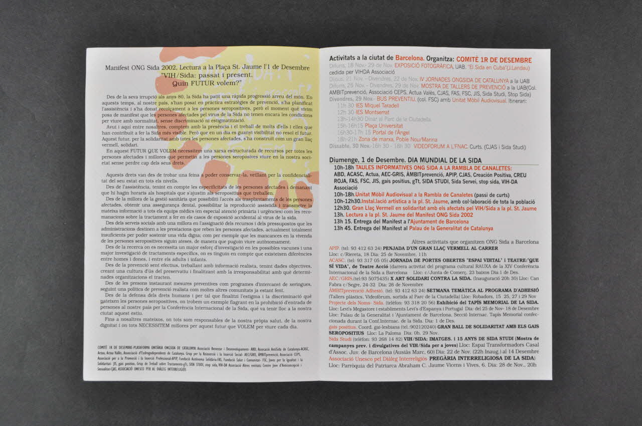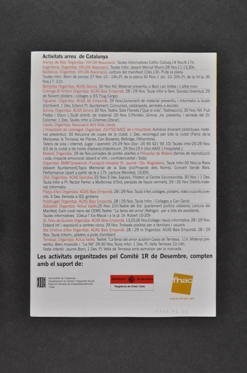 Au dos le texte est écrit en noir et rouge, et liste les activités organisées en Catalogne pour le 1er décembre, avec en partie inférieure le logo de la Genralitat de Catloge, La mairie de Barcelone (surligné en rouge), et la FNAC.