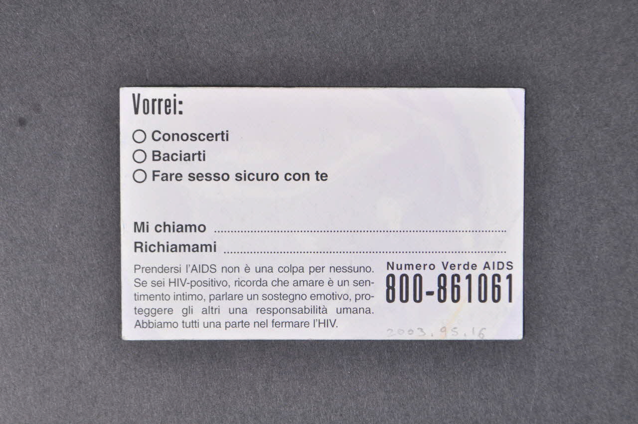 Carte de rendez-vous, "Vorrei Conoscerti / Baciarti / Fare sesso sicuro con te..." (Je voudrais te connaître, t'embrasser, avoir des relations sexuelles sûres avec toi)