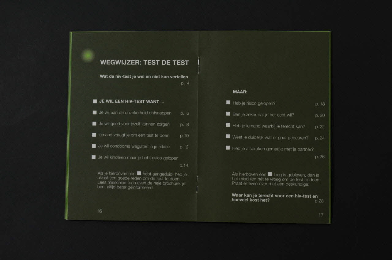 Een boekje voor mensen die een hiv-test overwegen (inscription en noir sur fond vert en haut de la page, sous le titre), sur la couvertureDate