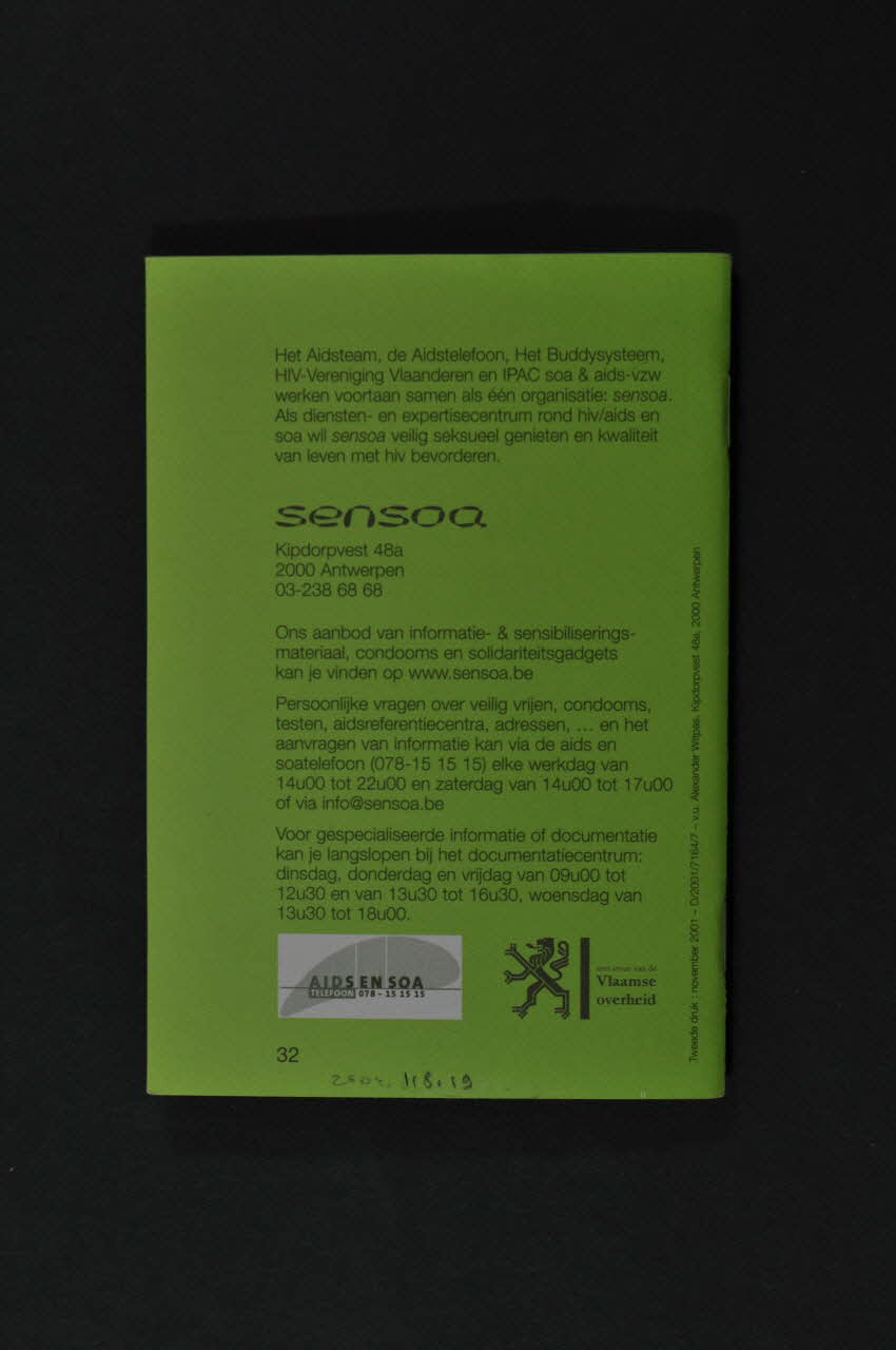 - AIDS EN SOA // TELEFOON // - met steum van de // Vlaamse // overheid (deux logos en bas du dos de la brochure), versoDécor