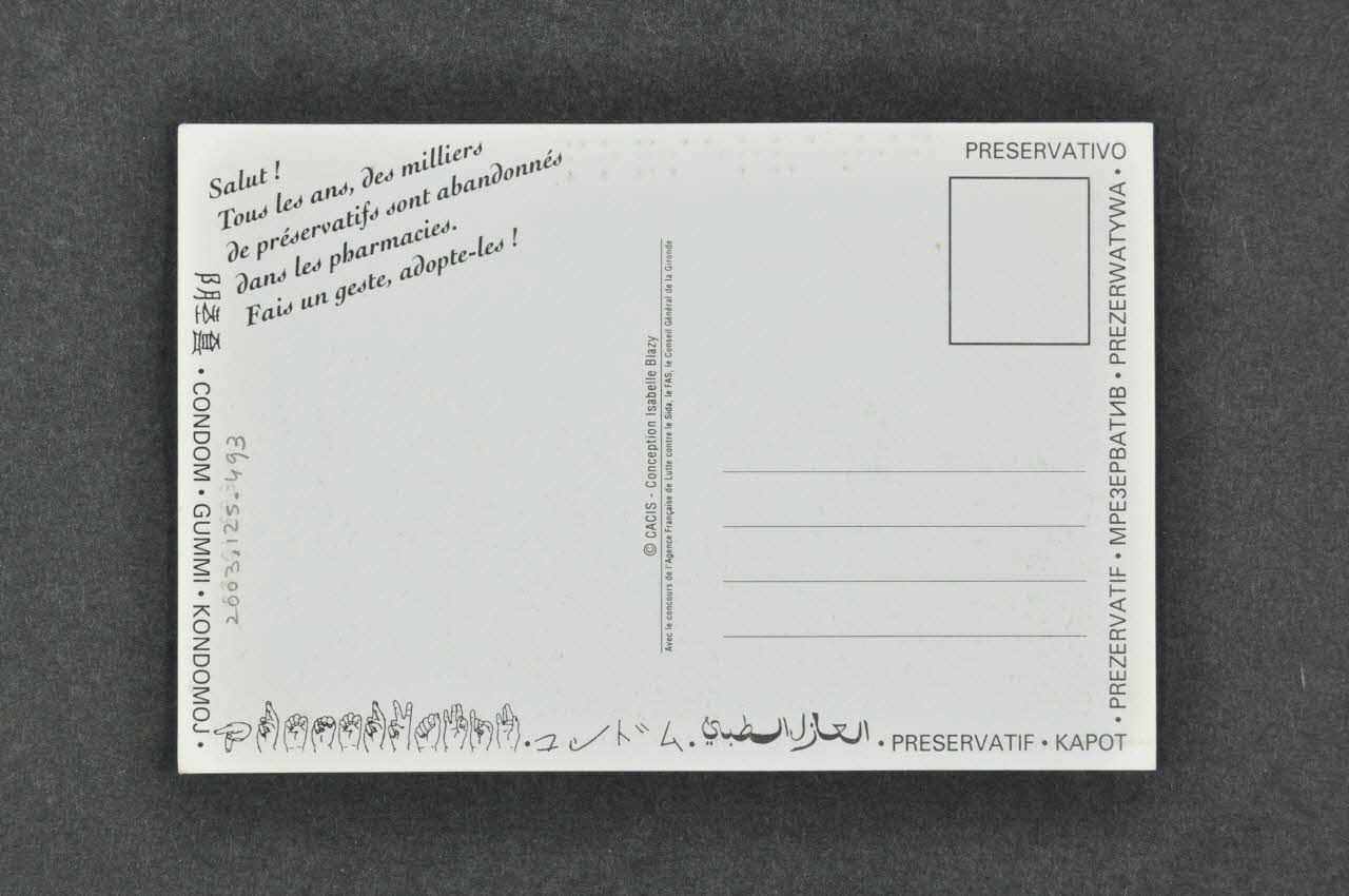Deux avis valent mieux qu'un... (dans le coin inférieur gauche sous la photographie), rectoSalut ! // Tous les ans, des milliers // de préservatifs sont abandonnés // dans les pharmacies. // Fais un geste, adopte-les ! (inscription en noir dans le coin supérieur gauche), versoConcernant le lieu d'édition