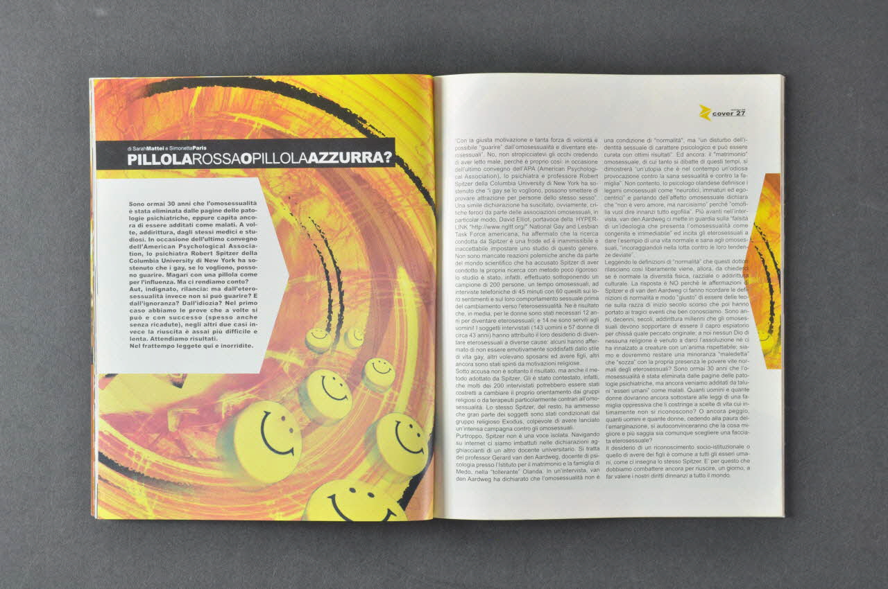La couverture est composée autour d'un grand ciel bleu, et d'herbe verte sur laquelle, une pilule géante est posée sur laquelle est écrit : « eterox2004 ». A gauche, au centre, en blanc sur bandeau noir : « On peut guérir de l'hétérosexualité». En haut, à droite, en bleu sur fond blanc, le nom de la revue et à gauche, en petit, la date. La revue présente des interviews, des articles sur l'homophobie, le mariage homosexuel. On trouve pages 60-61 des nouvelles du sida dans le monde : Suisse et pays pauvres, Italie et transplantation d'organes, Norvège et création d'une « super seringue », Europe et le risque d'hépatite C, Allemagne et expérimentation d'un vaccin, Russie et croissance constante du sida.Inscriptions